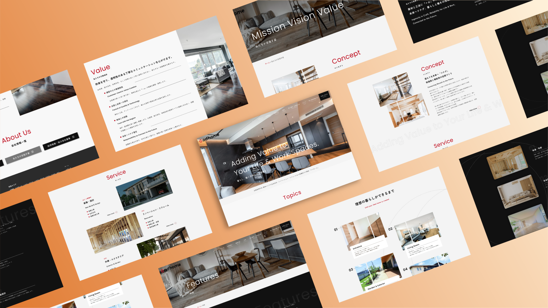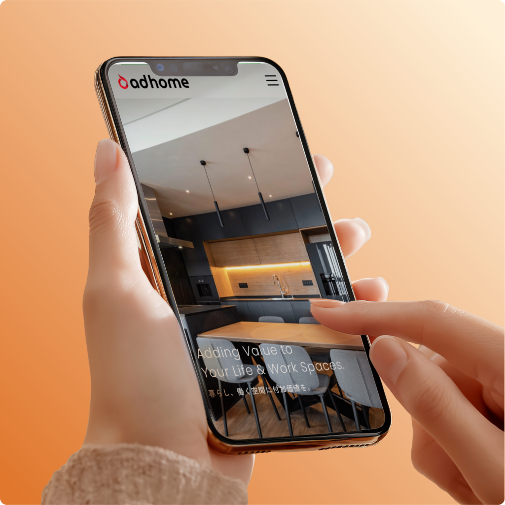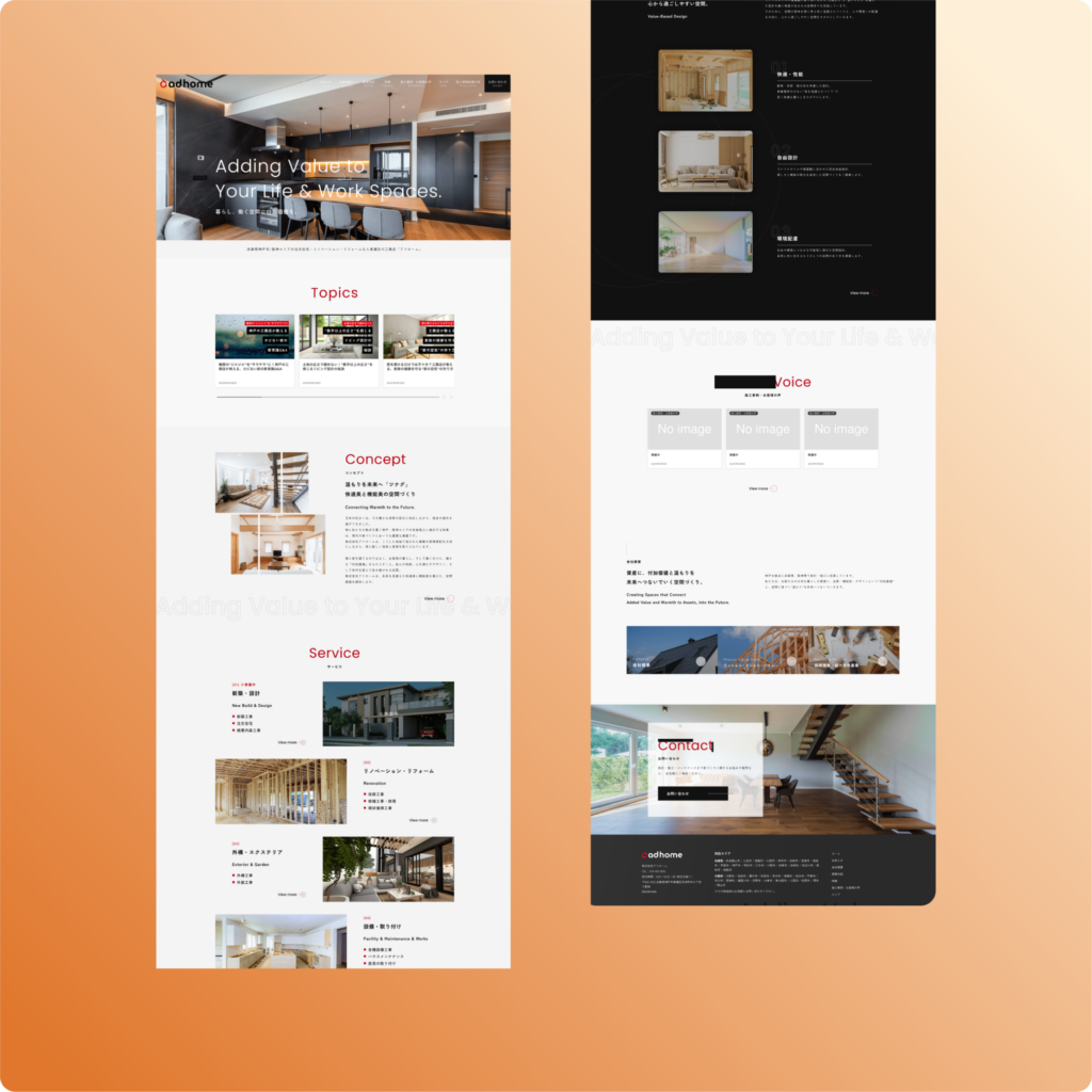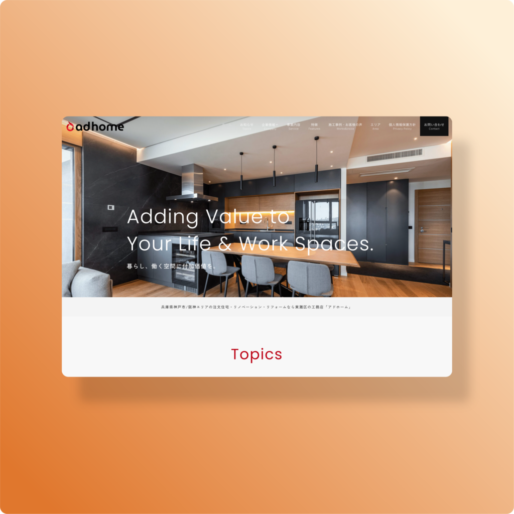 最初にビジュアルで世界観を伝えつつ、段階的に理解を深められる構成にしました。アドホームはデザイン性の高い施工事例が多く、情報過多により迷いが生じやすい特性があります。そのため、TOPでは細かな説明を抑え、「Concept」「Service」「Features」を順序立てて配置しました。施工事例は完成写真を中心とし、専門的な仕様説明は省略しています。これは、閲覧者が比較検討段階で重視する判断材料を優先したためです。