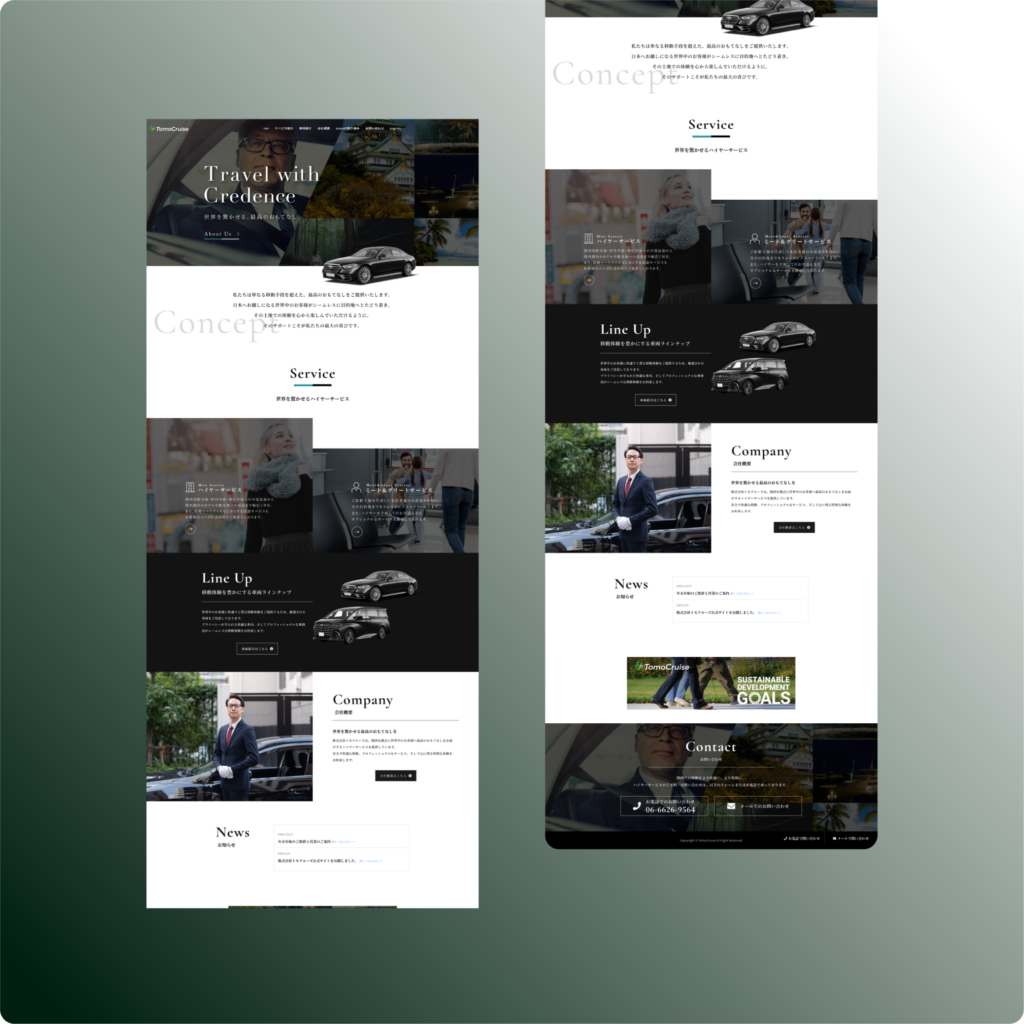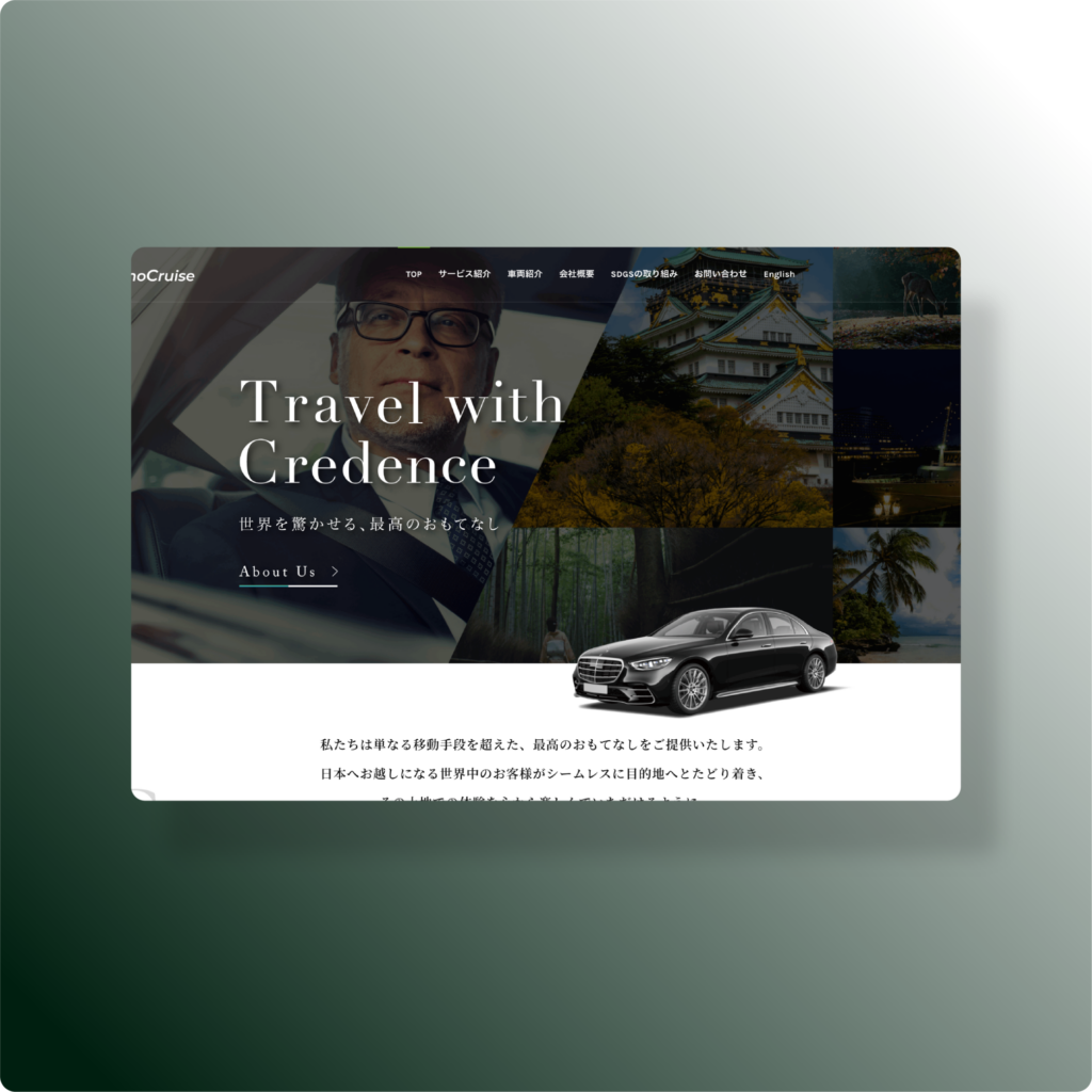 「信頼(Credence)」をテーマにした高級感のあるデザインにより、移動の質にこだわる層に響く世界観を構築しました。視覚的な情報の絞り込みと洗練されたレイアウトが、ブランドの品格を表現しています。