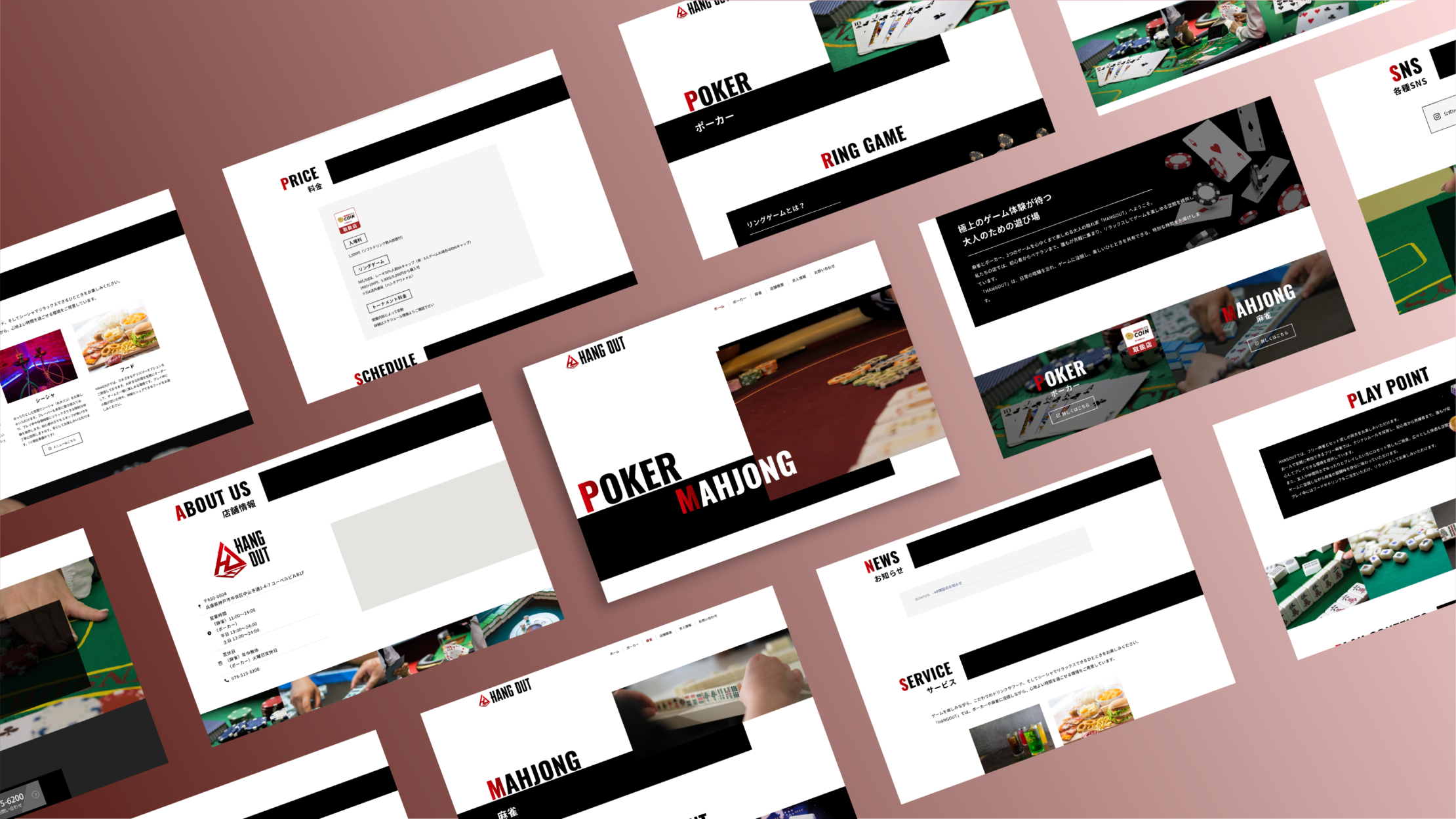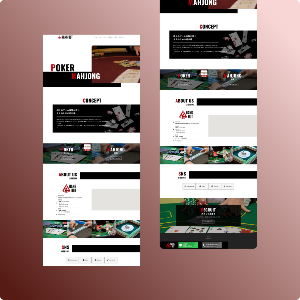 本サイトは、HANG OUTが提供するポーカー・麻雀の場を、単なる娯楽施設ではなく「大人が安心して遊べる場所」として認識してもらうことを目的に設計しました。ギャンブル性や敷居の高さで敬遠されやすい業態だからこそ、初見でも雰囲気とルールが把握できることが重要でした。