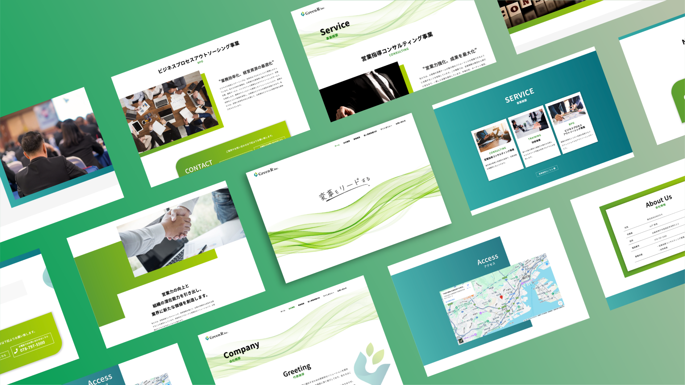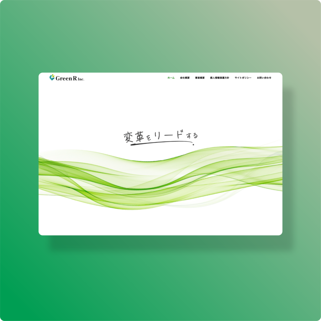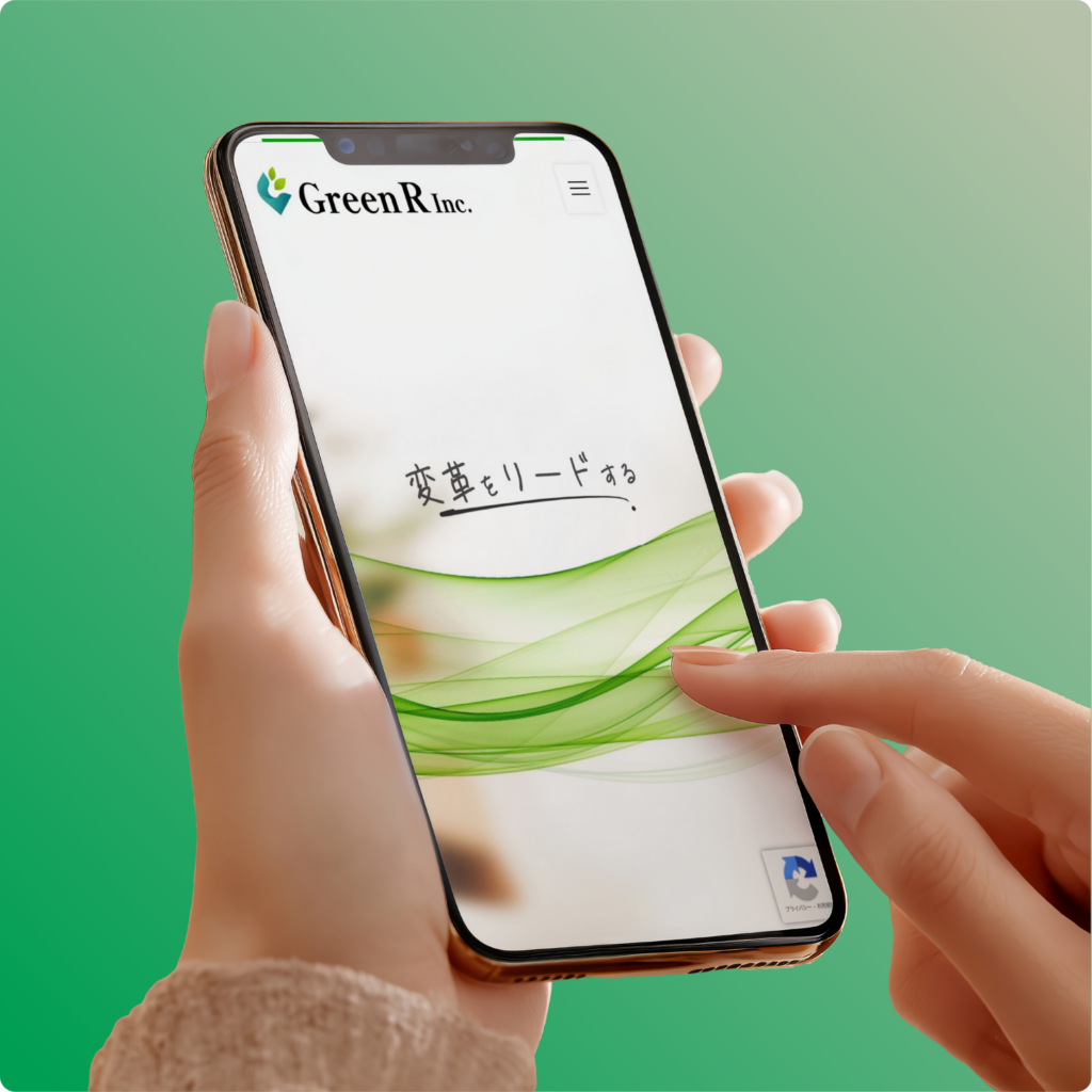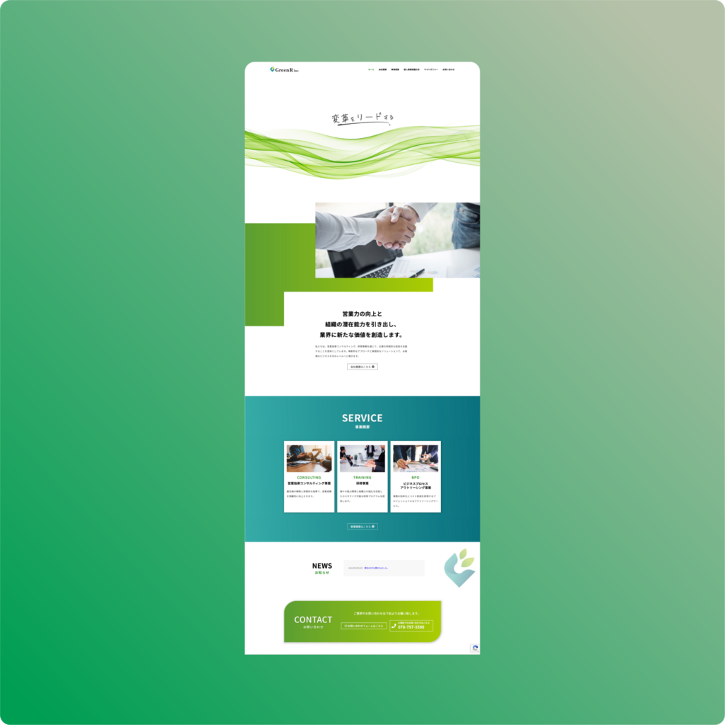 事業概要では、コンサルティング・研修・BPOの3つのサービスをカード形式で並列配置し、それぞれの役割と違いが一目で分かる構成としています。また、メインビジュアルに「変革をリードする」という力強いメッセージと、固い握手を交わす実写写真を組み合わせました。装飾を抑えたホワイトスペースを広く取り、コーポレートカラーの緑をアクセントとして活用することで、清潔感とプロフェッショナルな信頼性を視覚的に印象づけ、BtoB取引における心理的障壁を下げる設計としています。
