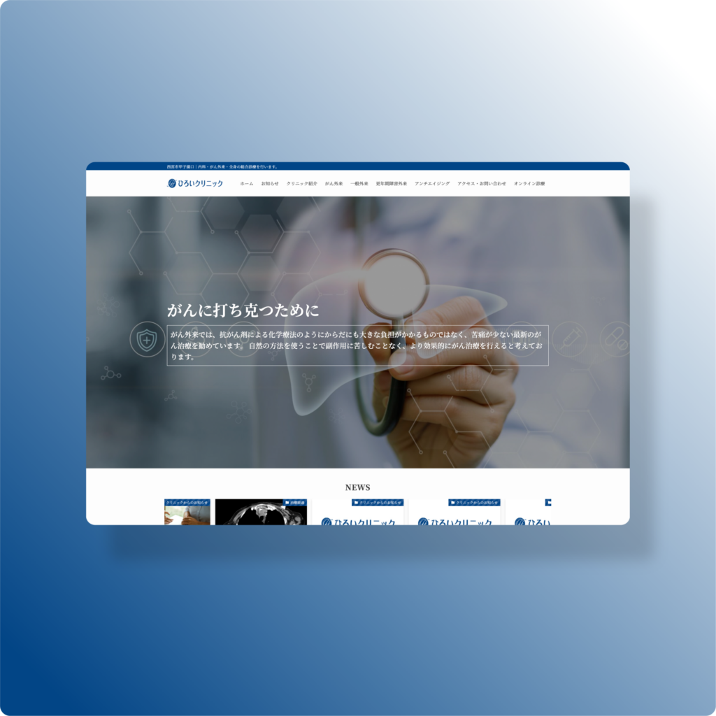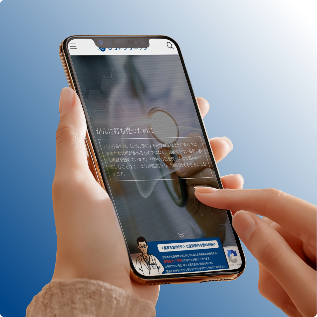 「がんに打ち克つ」というメッセージを軸に、専門性と親しみやすさを統合したデザインを採用しました。患者様の心に寄り添うビジュアルと、情報の正確さを両立させることで、受診への心理的ハードルを下げる構成を実現しています。