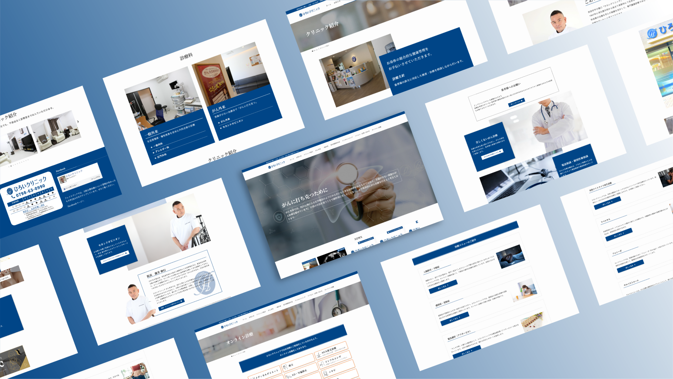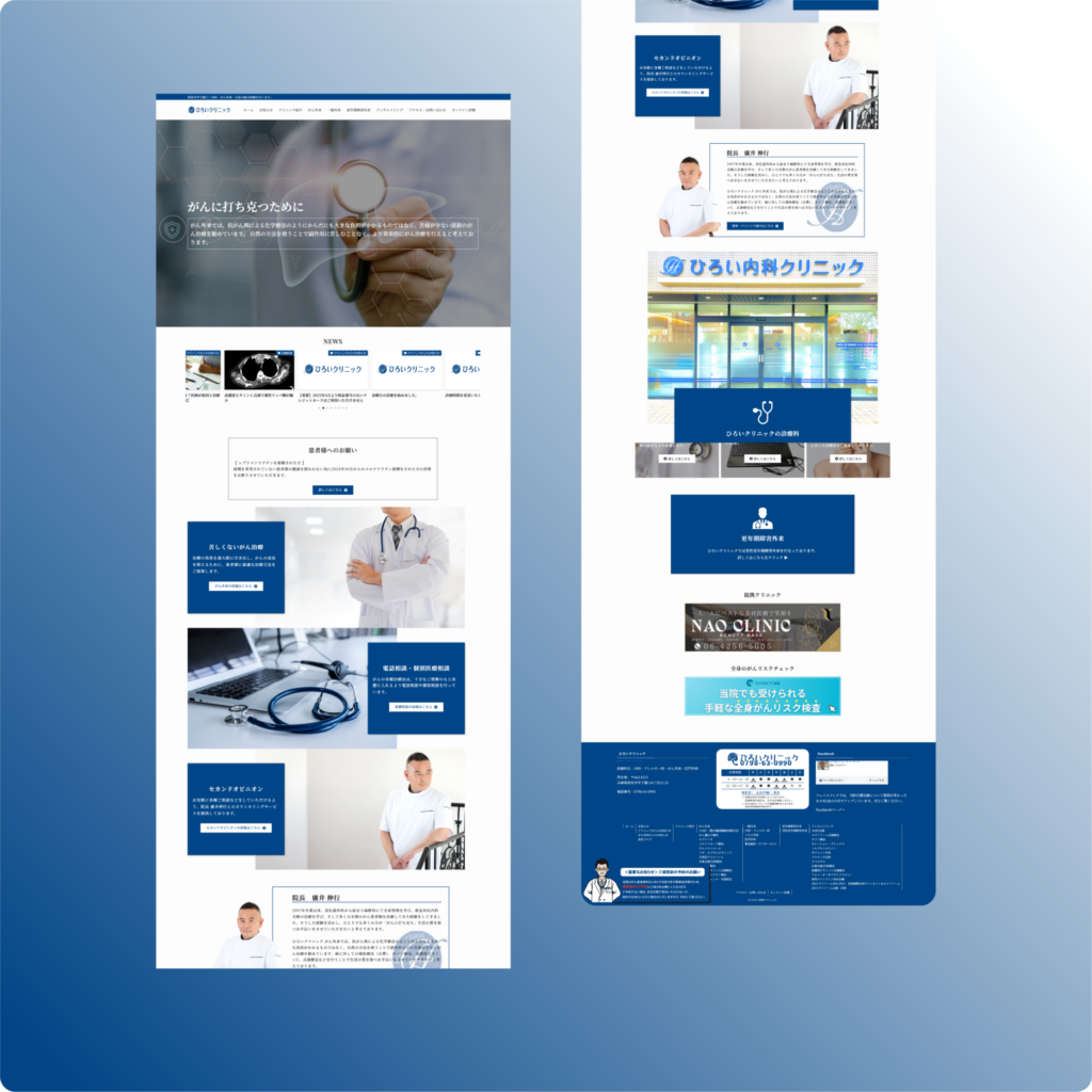 今回の制作では、医療機関としての「厳格な信頼」と「温かな安心感」の両立を最優先しました。具体的には、誠実さを象徴する濃紺(ネイビー)を基調としつつ、医師の顔が見える写真や院内の清潔な風景を多く配置しています。これは、高度な治療を検討される方ほど「誰が診るのか」「どのような環境か」という具体的な情報を重視すると考えたためです。検診メニューや各外来の情報は、整理されたタイル型のレイアウトで配置し、直感的に目的の情報へ辿り着けるよう設計しました。