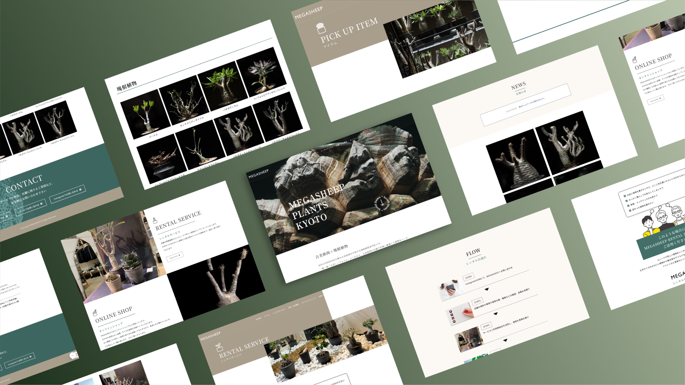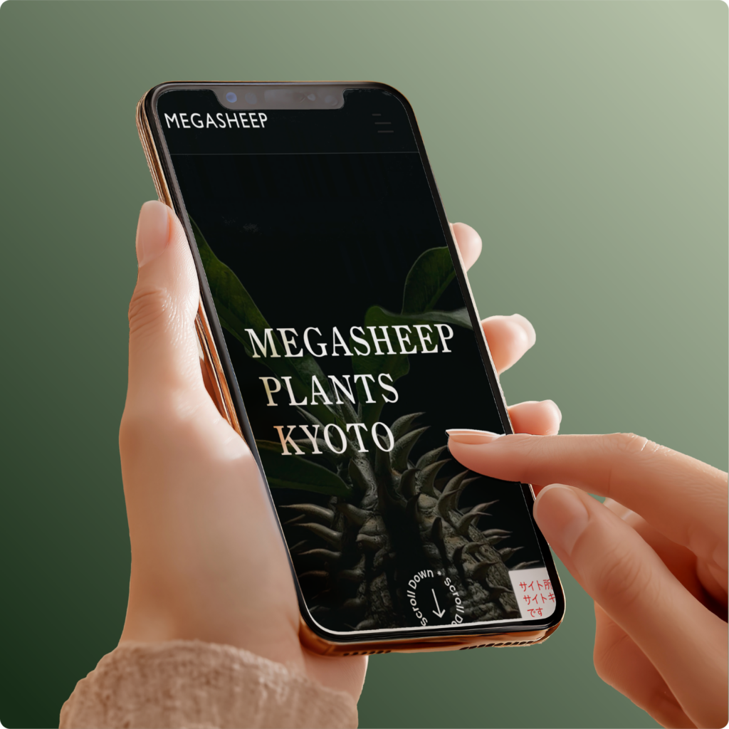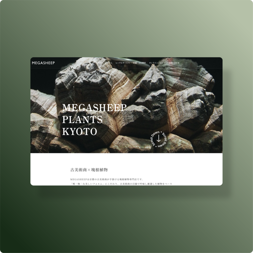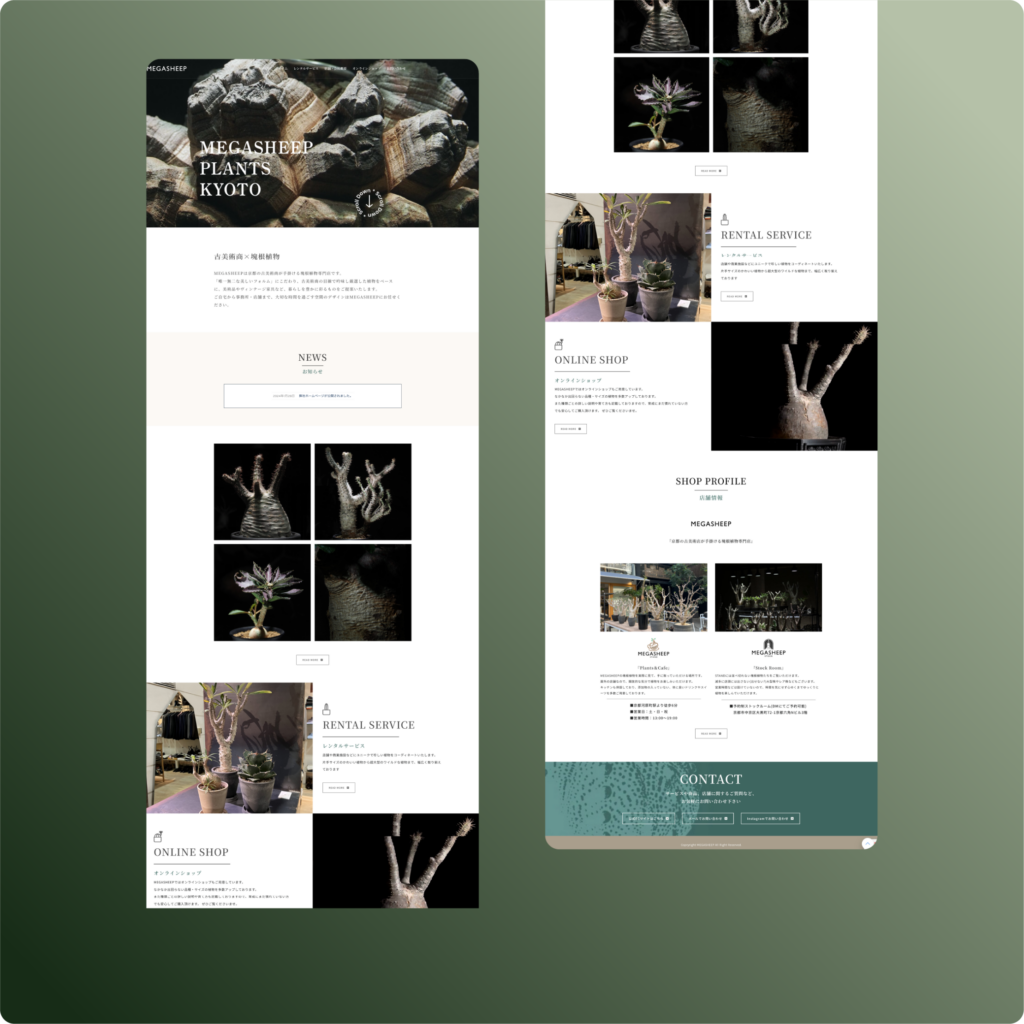 本サイトの目的は、京都を拠点とするブランド「MEGASHEEP」の世界観を提示し、オンライン販売や法人向けレンタルサービスの成約につなげることです。植物を単なる園芸品としてではなく、自然が造り出した造形美を愉しむものと位置づけ、ブランドの価値を高める必要がありました。