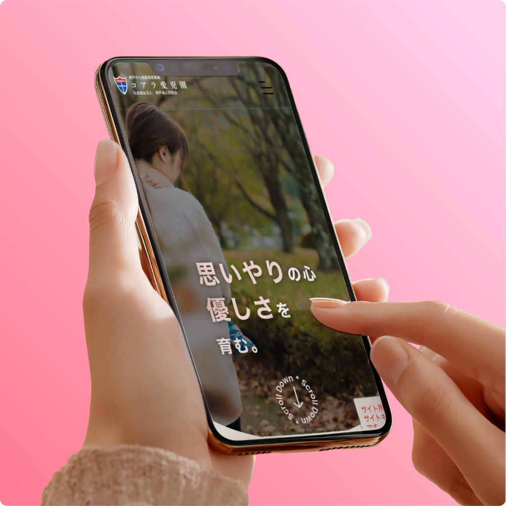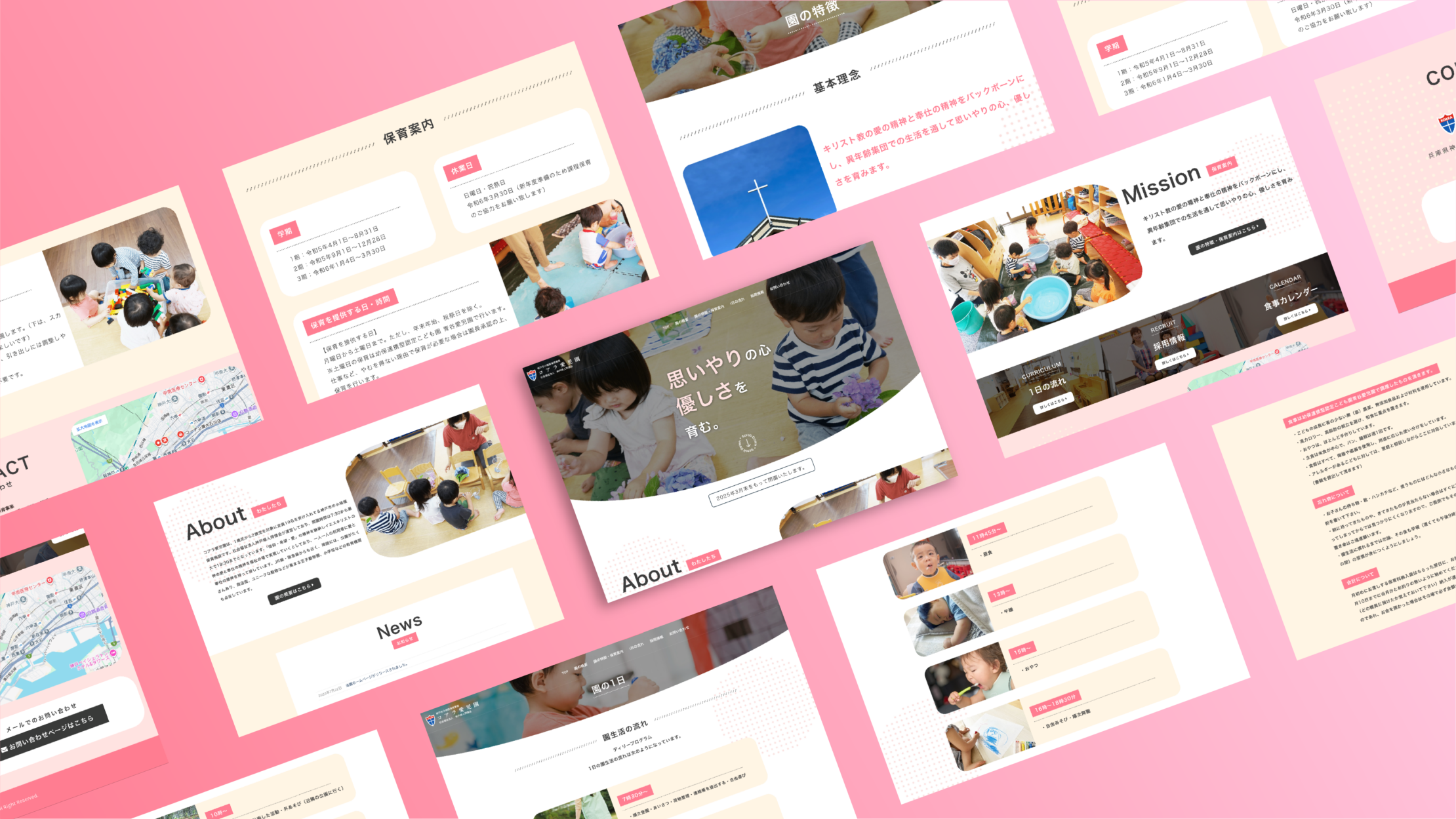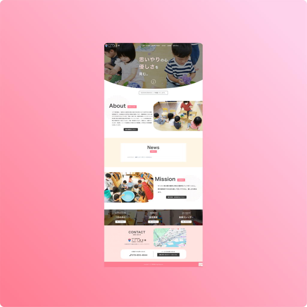 今回の制作では、園児たちの日常が直感的に伝わるよう、円形に切り抜かれた柔らかなビジュアルを多用したデザインを採用しました。特に本サイト特有の工夫として、保護者の方が最も関心を寄せる「1日の流れ」や「食事カレンダー」への導線をTOPページ下部にカード形式で明示しています。これは、日々の生活リズムや食育の質を具体的に提示することで、言葉だけでは伝わりにくい「預けた後の安心感」を裏付けるためです。また、全体を淡いピンクと白で統一し、園の優しさを視覚的に表現しました。