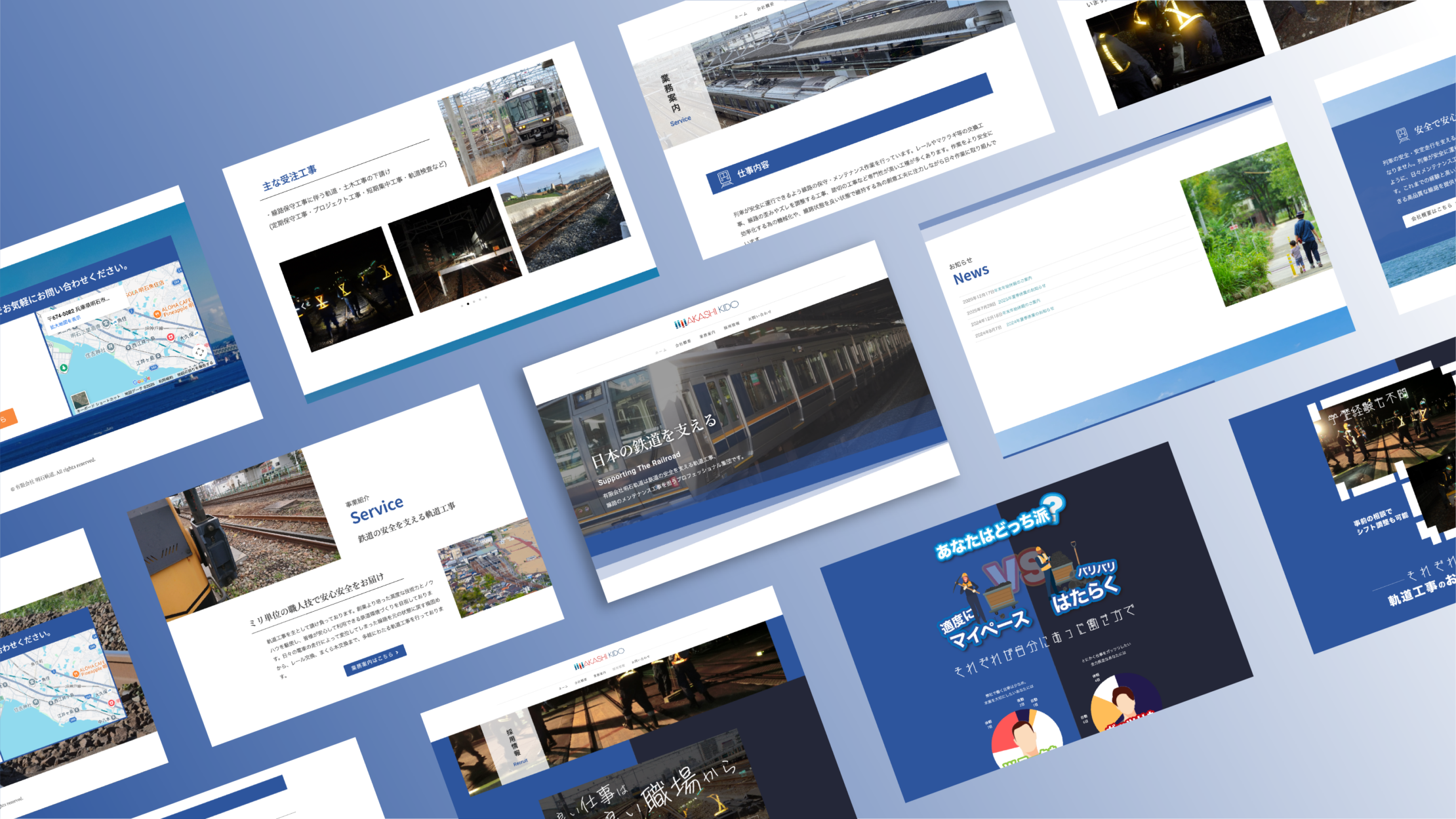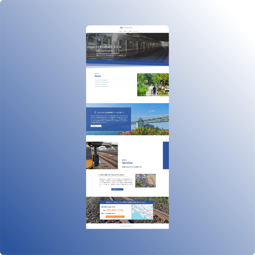 「日本の鉄道を支える」という使命を軸に、情報の正確性と現場の臨場感を両立させたレイアウトを構築しました。専門的な施工プロセスを丁寧に可視化することで、確かな信頼関係の構築につながる導線を実現しています。