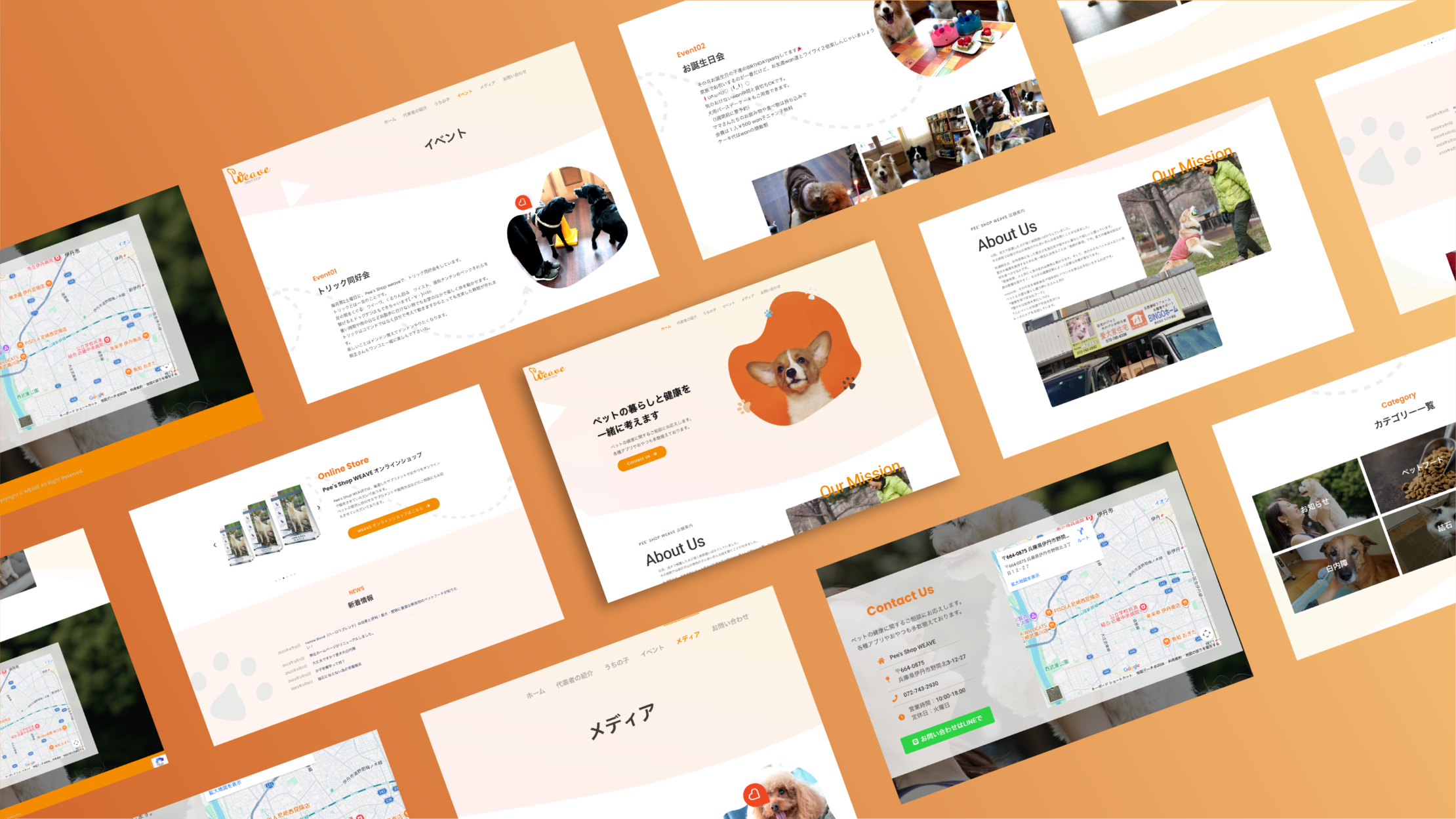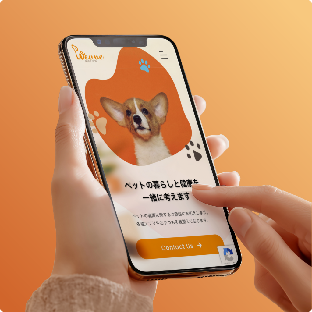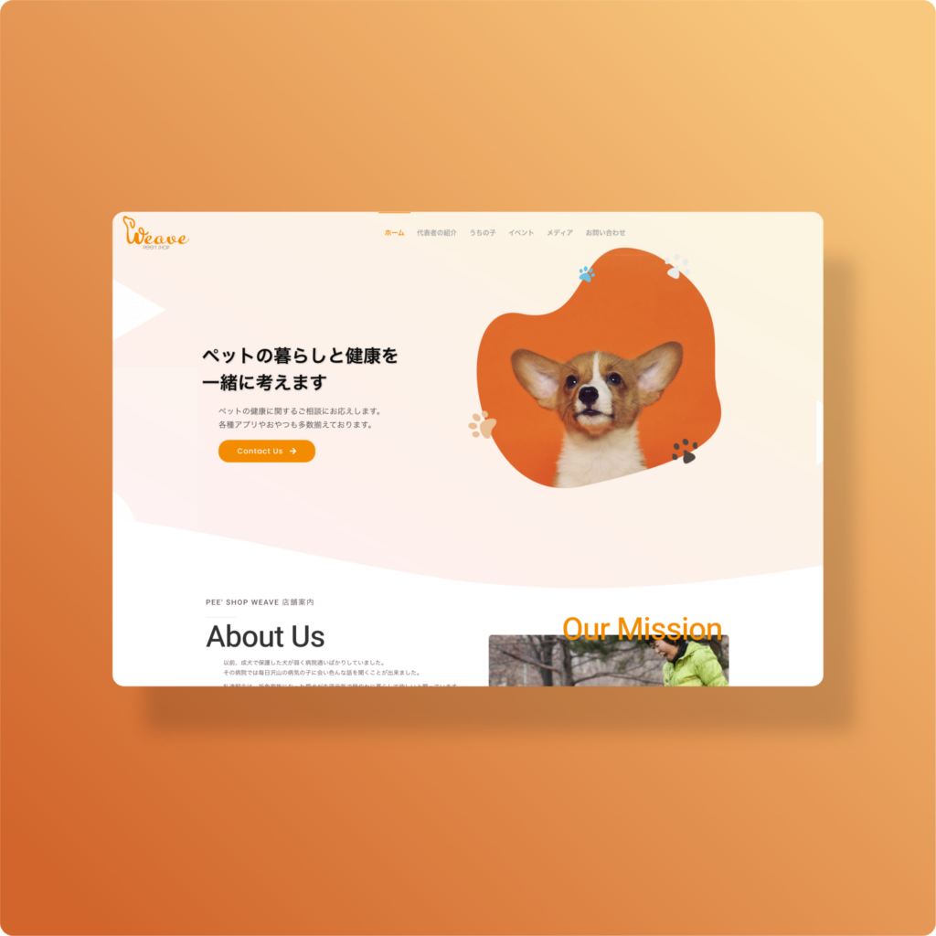 温かみと安心感を伝えるため、オレンジをアクセントカラーに配し、ペットの柔らかな表情を捉えた写真を多用した親しみやすいデザインを採用しました。
