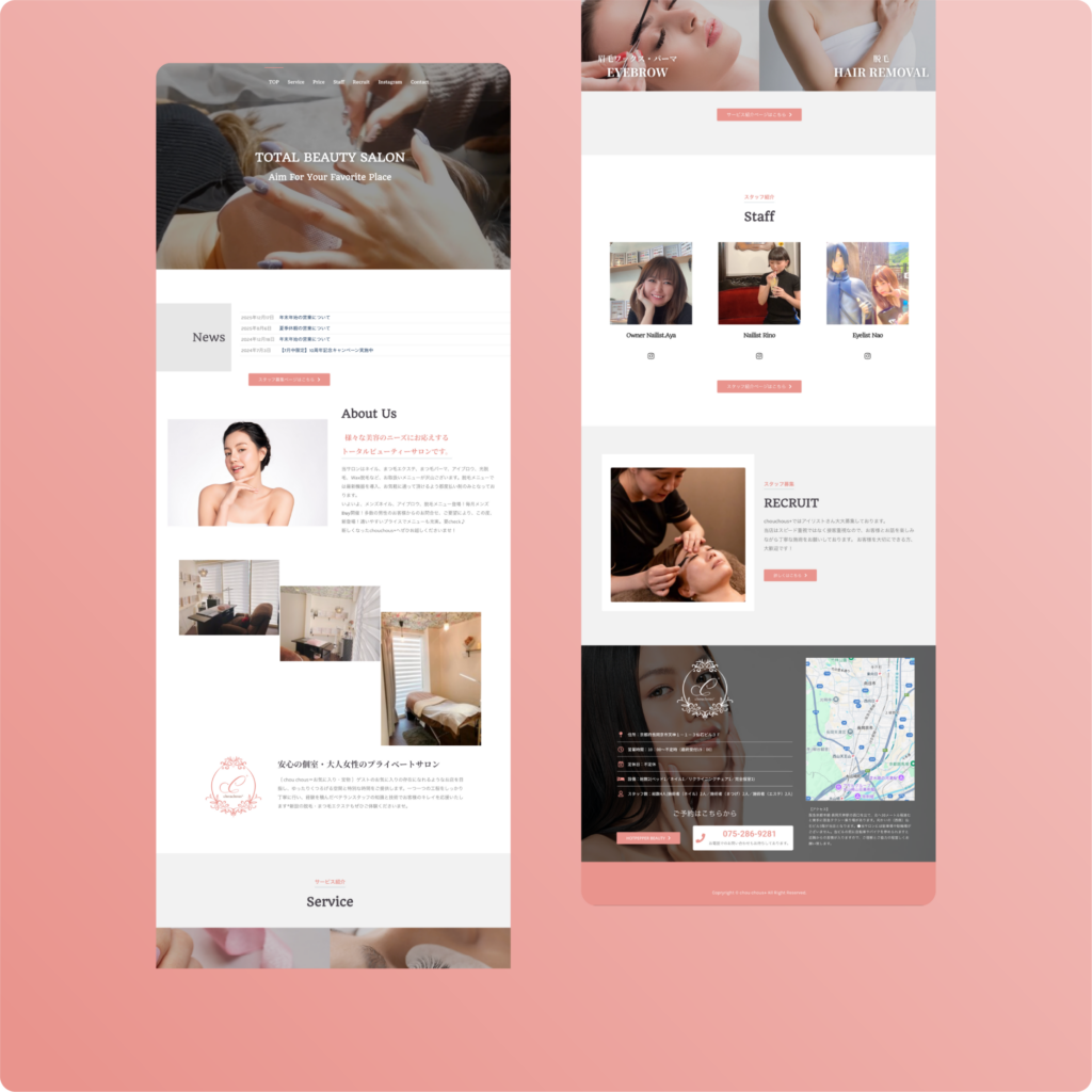構成面では、中盤の「Service」セクションにおいて、各メニューごとに実際の施術例を確認できるギャラリーへの導線を設けています。これにより、ユーザーが希望する仕上がりのイメージを具体的に膨らませ、納得感を持ってサービスを選べるよう設計しました。また、実際に施術を担当する「Staff」の顔写真を掲載することで、初めての来店でも担当者の雰囲気が事前に伝わり、心理的なハードルを下げる工夫をしています。
