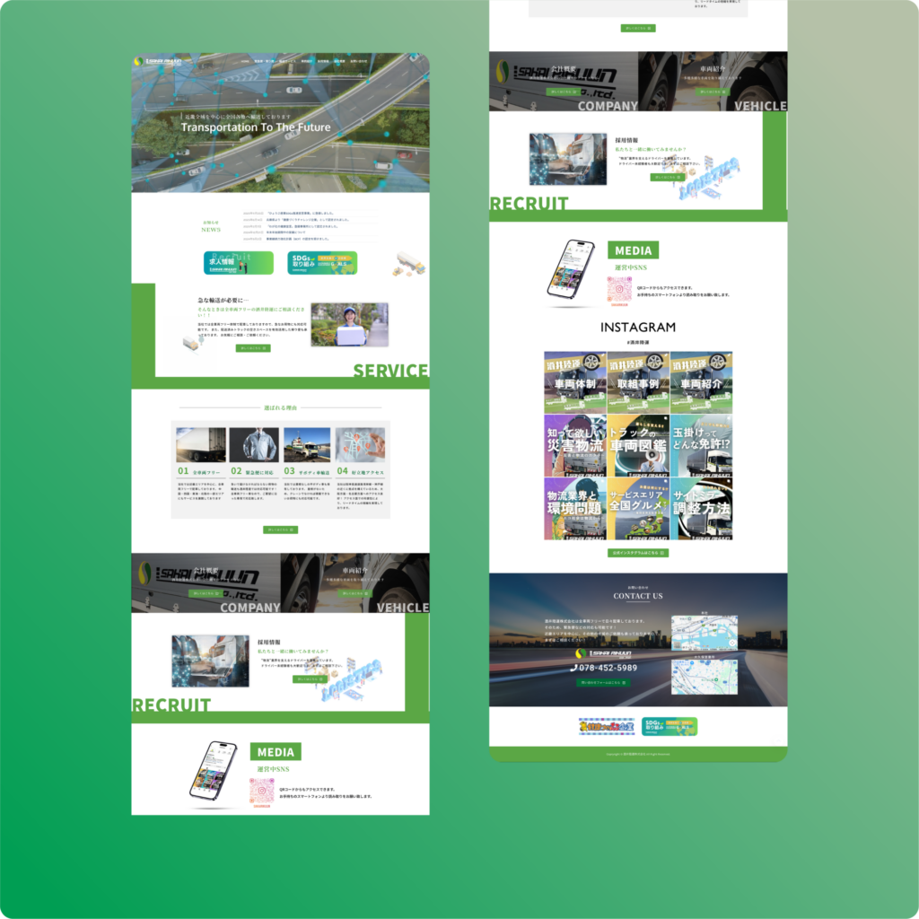 構成面では、中盤に「選ばれる理由」セクションを配置し、安全への取り組みや車両ラインナップなどの強みを項目ごとに整理しています。これにより、自社の技術力や信頼の根拠を明確に示し、顧客や求職者が抱く懸念を払拭する設計としました。また、SNS(Instagram)との連携も加えることで、日々の活動を通じたリアルな安心感を補完しています。