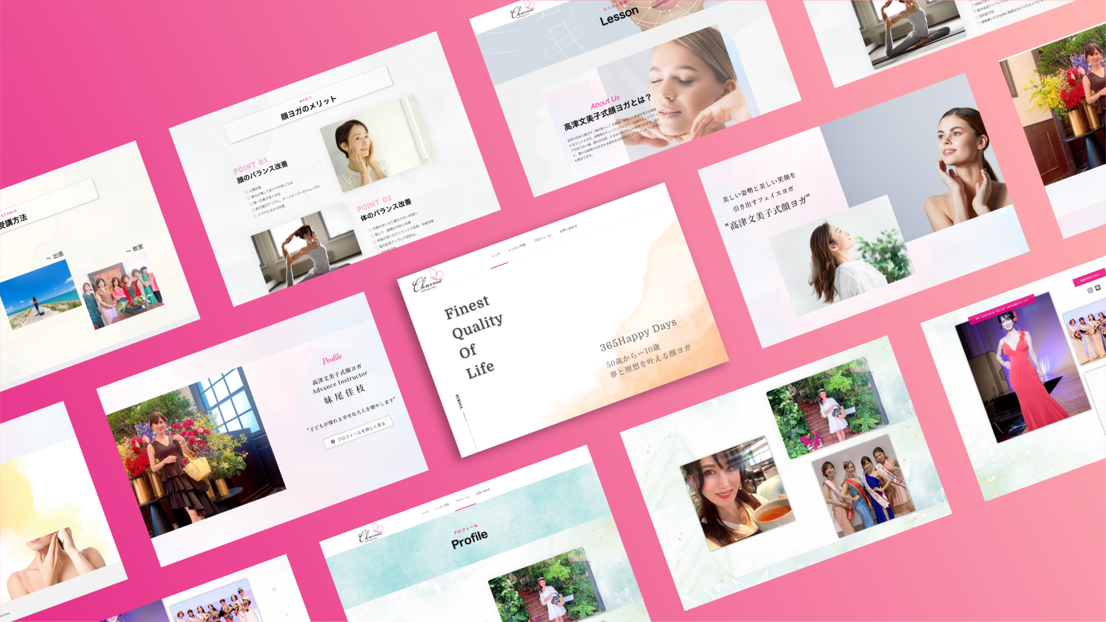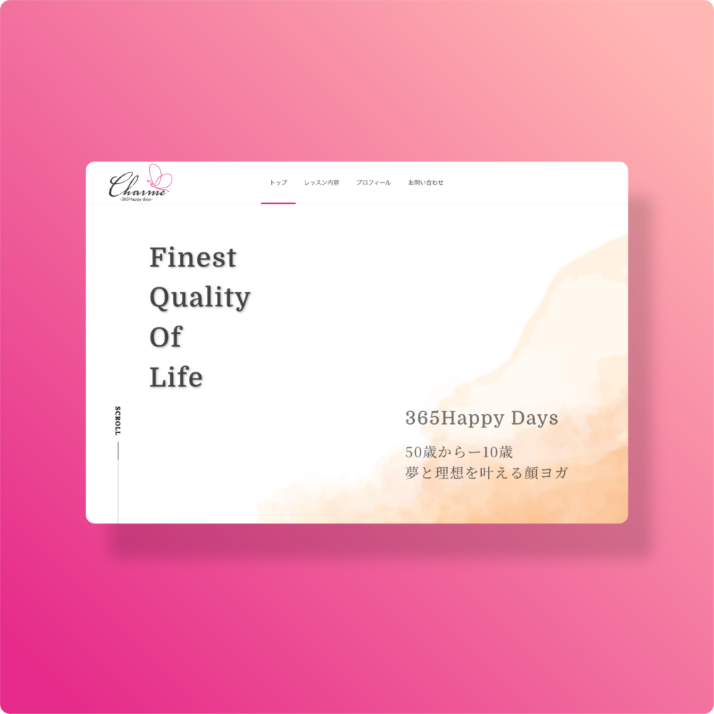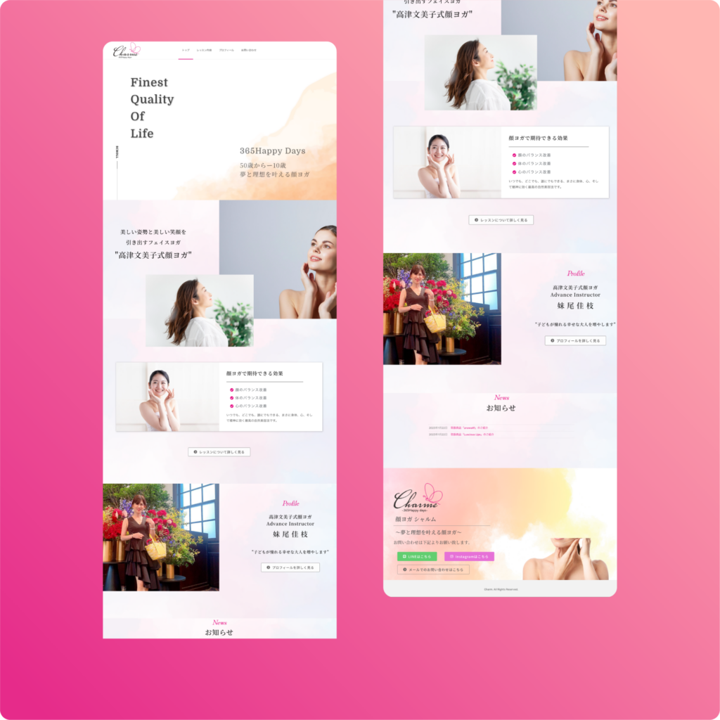 本サイトの目的は、加齢による顔の悩みを抱える女性に対し、顔ヨガによる「表情の若返り」と「自分への自信」を示し、体験レッスンの申し込みを獲得することです。講師自身の変化やメソッドの信頼性を可視化し、美容意識の高い層へ向けて「一生モノの美容習慣」としての価値を伝える必要がありました。