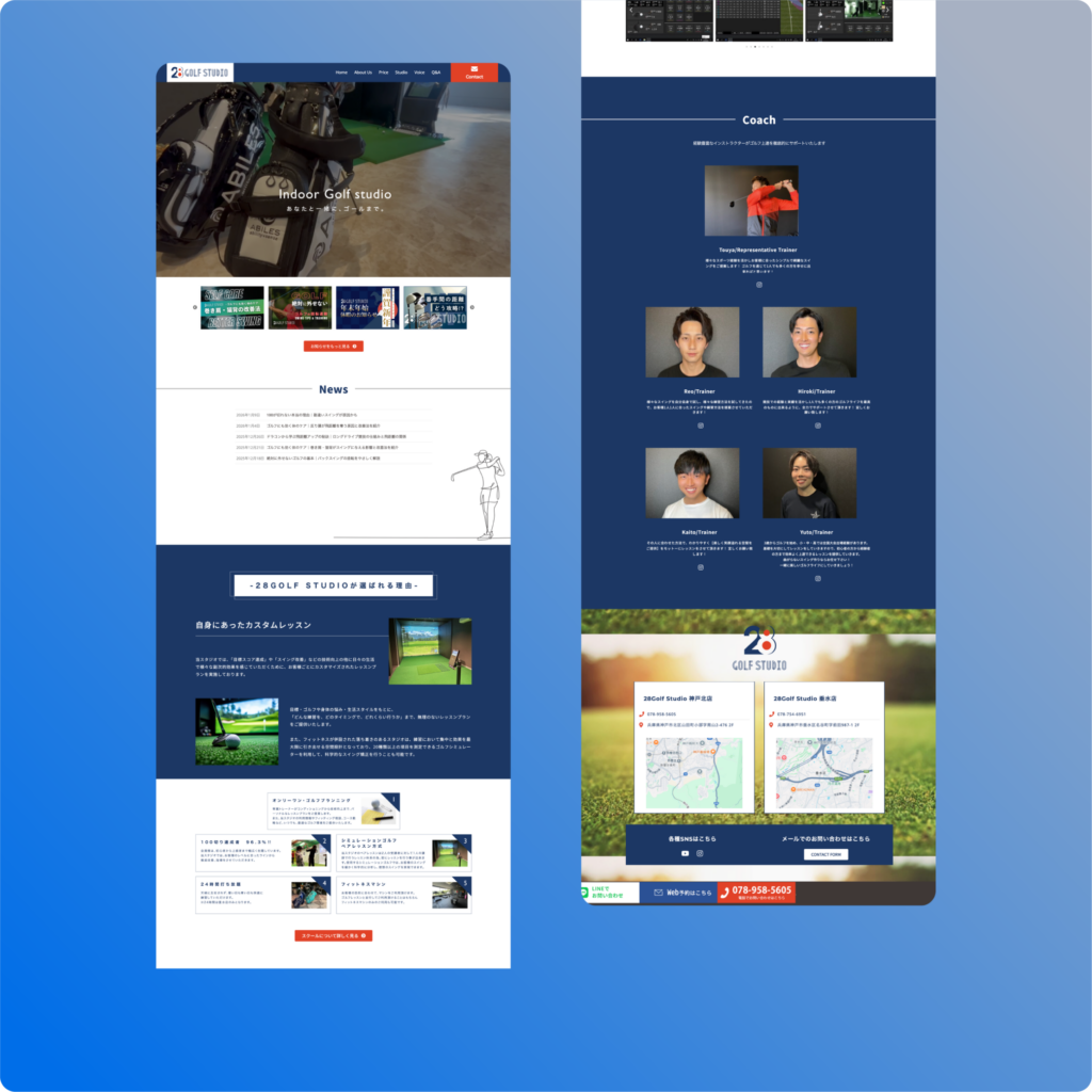 今回の制作では、情報の信頼性と親近感を両立させるため、悩みや関心に直接応えるコンテンツ配置を重視しました。構成面での大きなポイントとして、まず冒頭の「お知らせ」セクションにおいて、単なる運営情報だけでなく「ゴルフが上達するコツ」などの有益な記事を配置しています。これにより、初めて訪れた方に対しても専門知識の還元を行い、サイト全体のメディアとしての価値を高める設計としました。中盤の「選ばれる理由」では、設備の優位性を整理し、さらに終盤の「インストラクター紹介」では各講師の人柄や経歴を丁寧に提示しています。これらを段階的に配置することで、「ここなら上達できる」という確信を持っていただき、最終的なアクションへ導く構成に仕上げました。