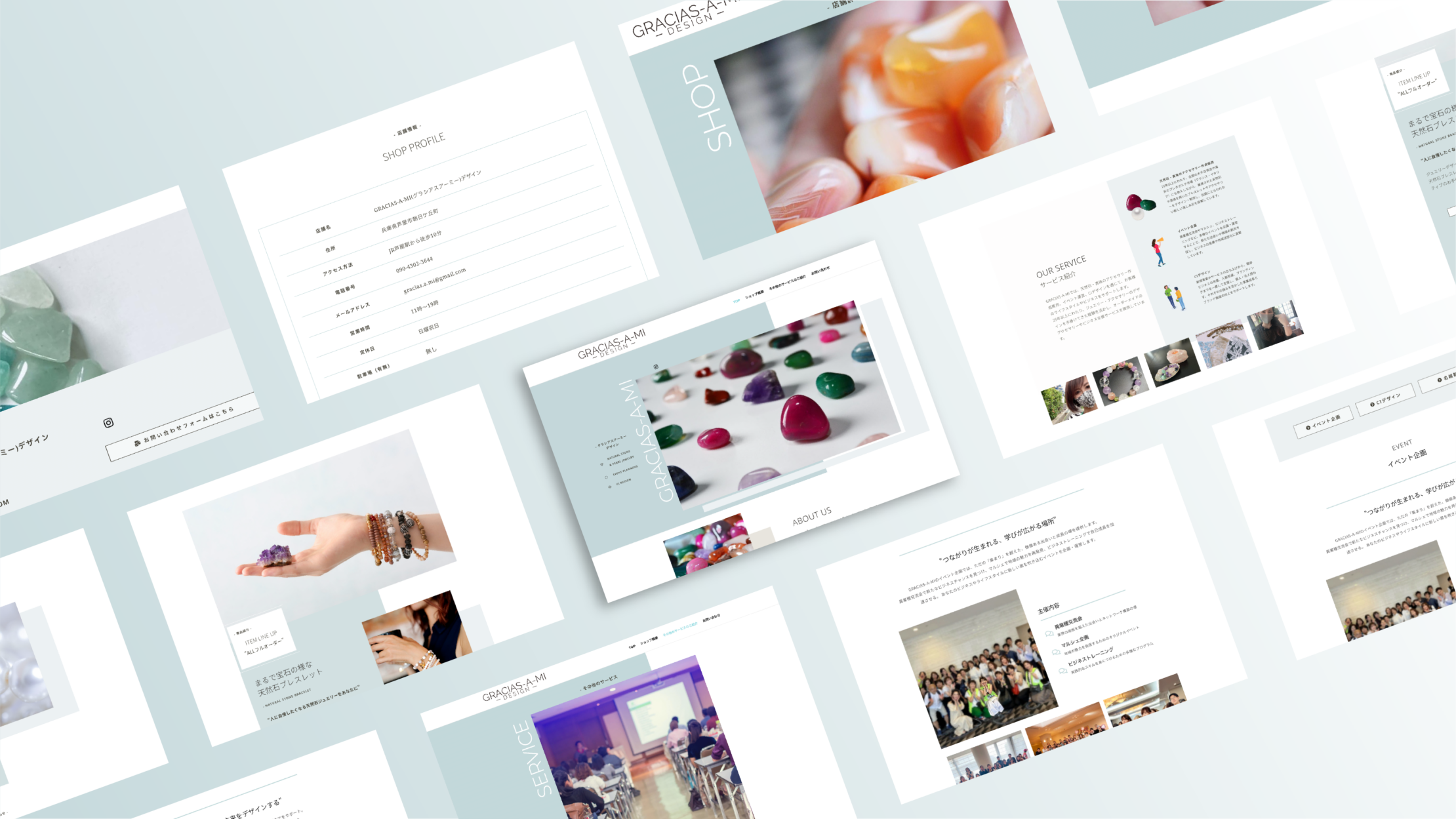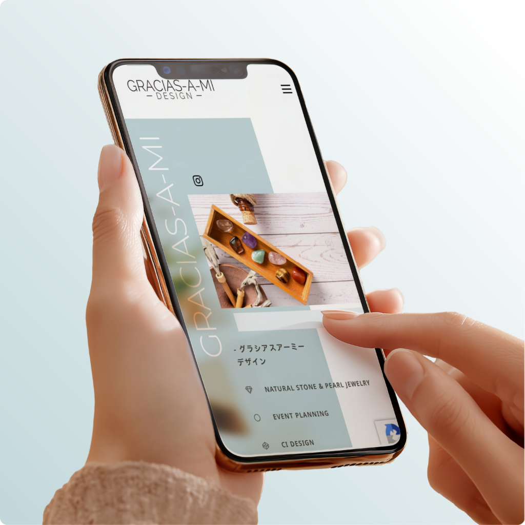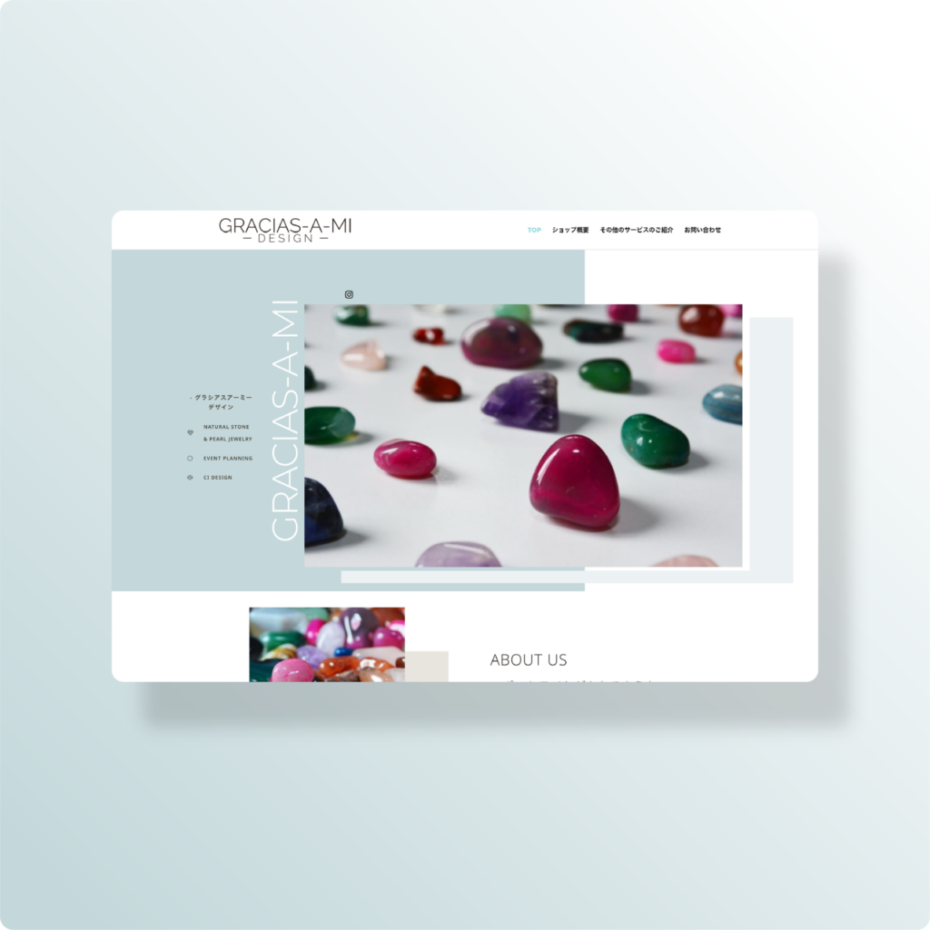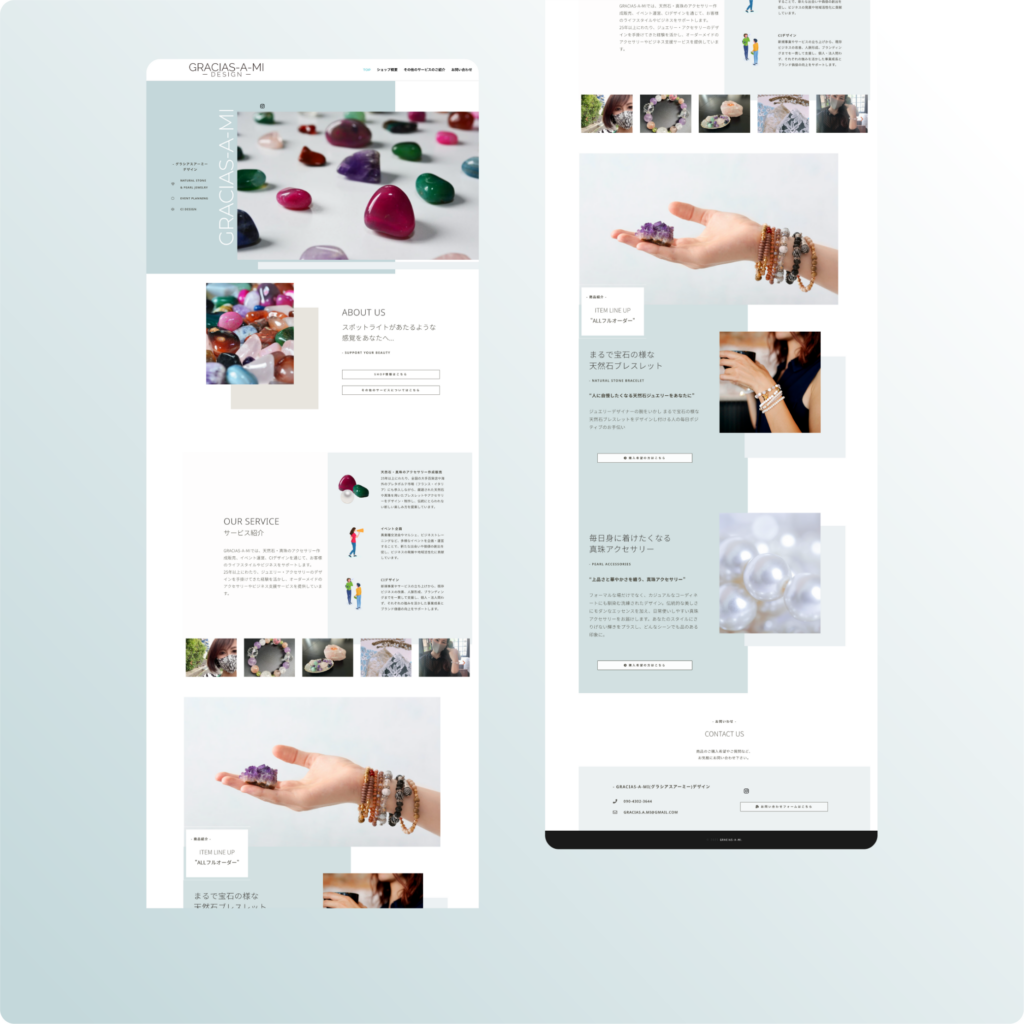 今回の制作では、天然石の鮮やかな色彩を最大限に引き立てるため、ニュアンスカラーのグレーやブルーを基調とした、透明感と品格を感じさせるデザインを採用しました。構成面での大きなポイントとして、サービス紹介(OUR SERVICE)では、実際の商品の着用写真を象徴的に配置しています。これにより、素材単体の魅力だけでなく、身に付けた際のサイズ感や肌馴染みの良さを直感的にイメージできる設計としました。また、中盤には「フルオーダー」の案内を独立させて配置し、個々の想いを形にするプロセスの存在を強調しました。さらに、「その他のサービス」では多岐にわたるサービスを整理して掲載することで、代表者のクリエイティビティと活動の幅広さを提示する工夫をしています。