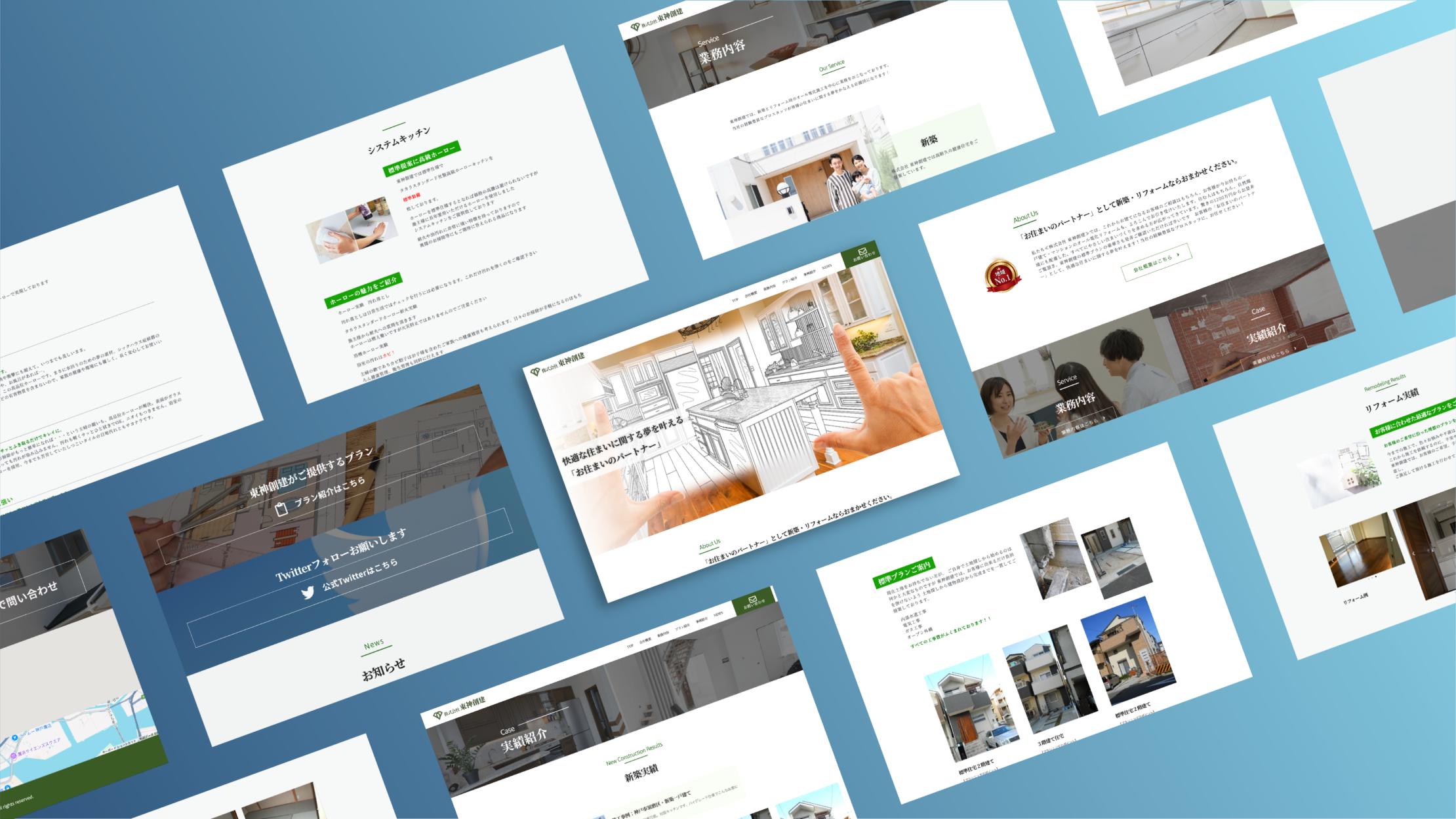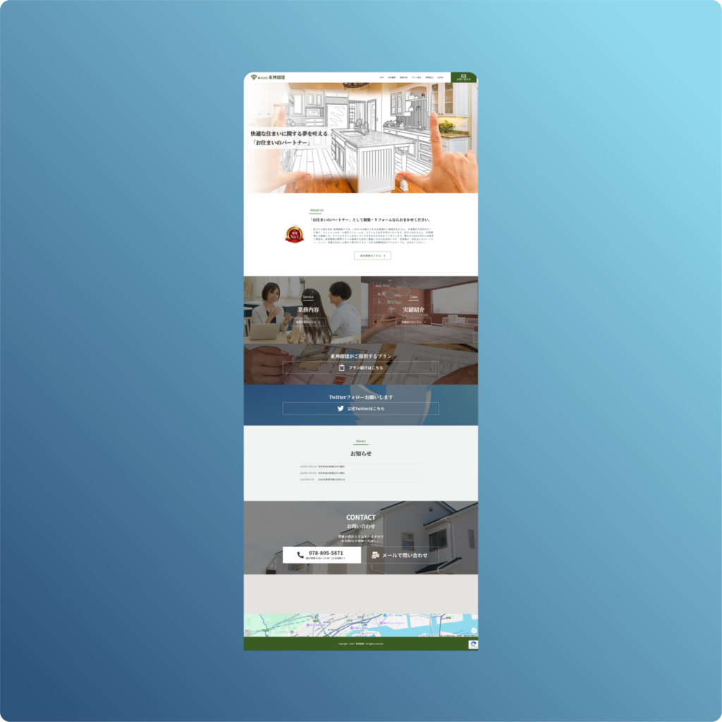 今回の制作では、住まいづくりのプロとしての誠実さと安心感を表現するため、落ち着いたグリーンとホワイトを基調とした、クリーンで視認性の高いデザインを採用しました。構成面での大きなポイントとして、メインビジュアルの直後に「お住まいのパートナー」としての想いを綴ったメッセージを配置し、企業の姿勢をまず言語化しています。また、中盤の「業務内容」セクションでは、キッチンや浴室といった具体的なリフォーム箇所を提示し、検討段階の方がご自身の悩みと照らし合わせやすい設計としました。続く「実績紹介」では、実際の施工事例を一覧化して配置することで、確かな施工品質と多角的な対応力を視覚的に証明し、相談への心理的ハードルを下げる工夫を施しています。