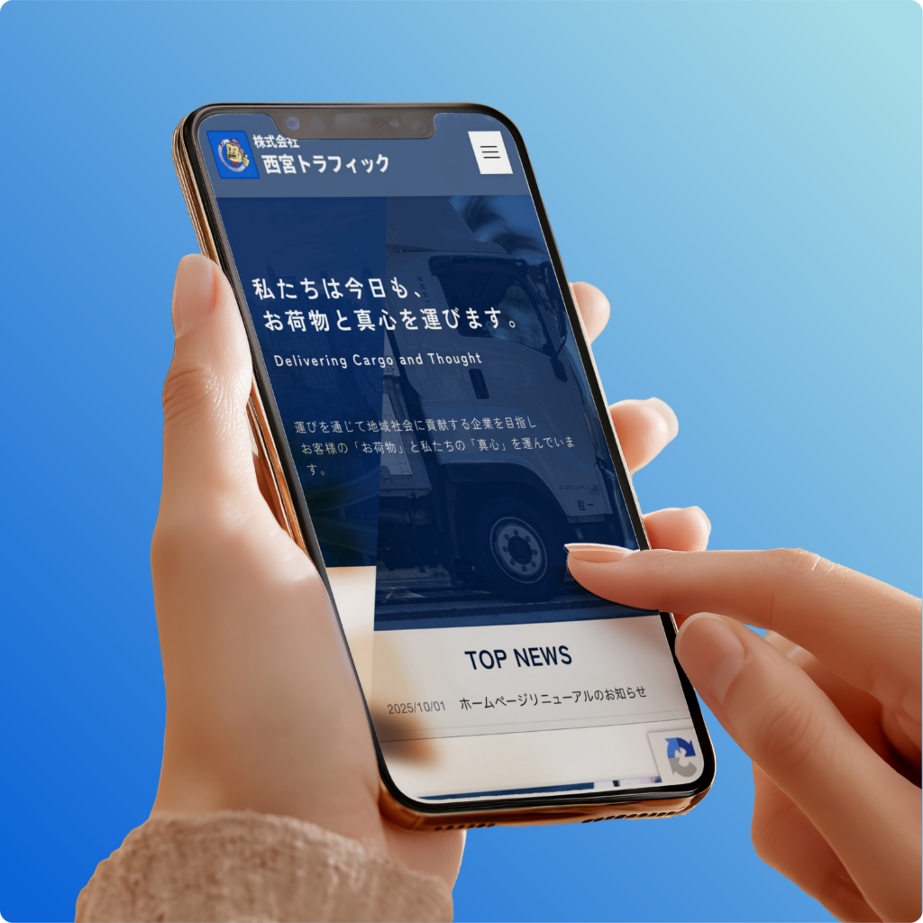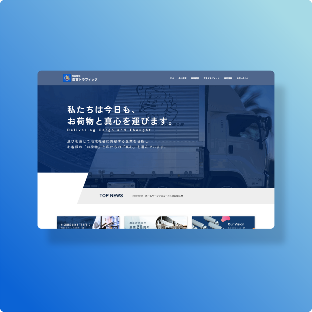 本サイトの目的は、物流のプロフェッショナルとしての「安全性」と「確かな輸送品質」を示し、新規の配送依頼や採用応募の獲得につなげることです。「お荷物と真心を運ぶ」という企業理念を軸に、自社車両や徹底した安全マネジメント体制を可視化し、物流のパートナーとしての圧倒的な信頼感を醸成する必要がありました。