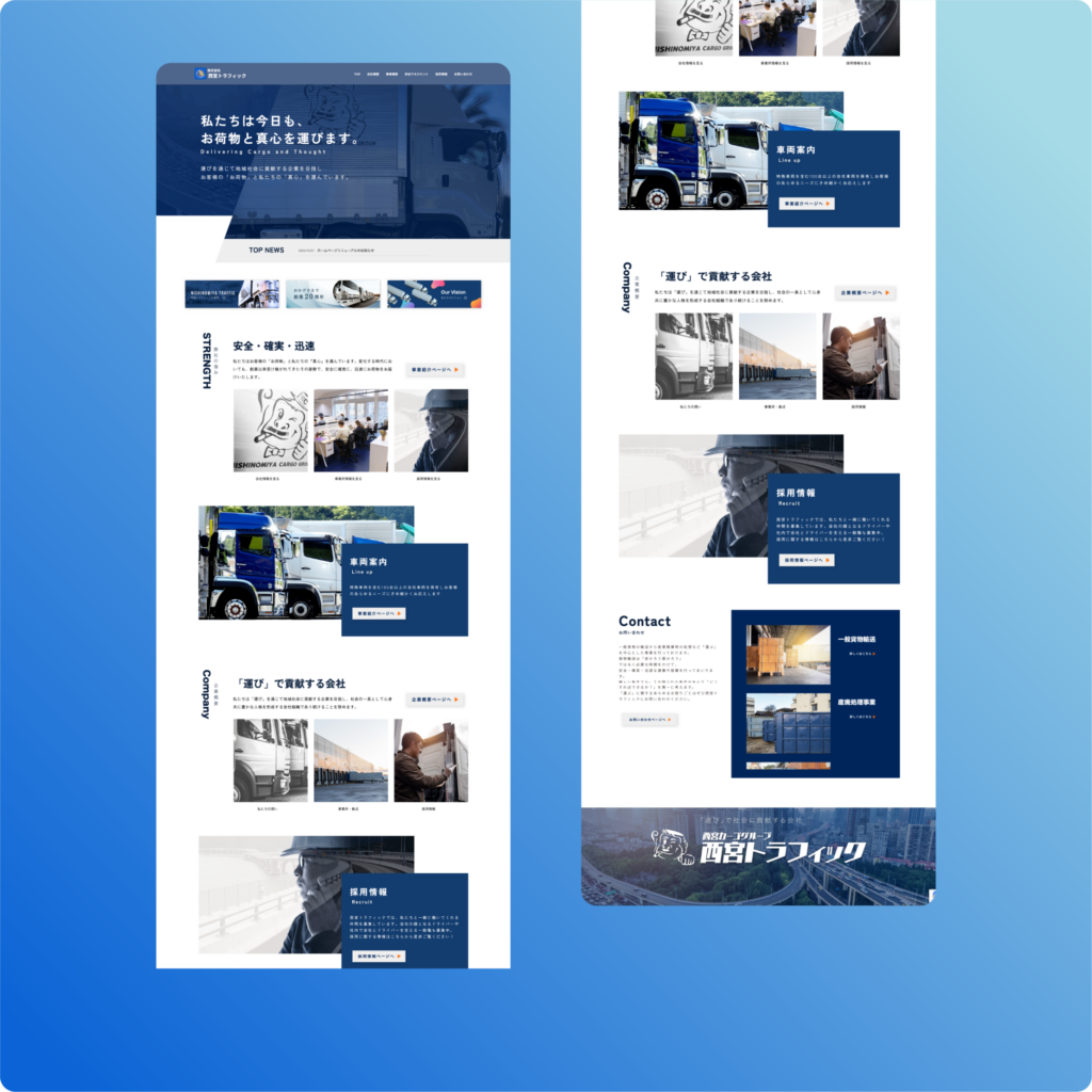 情報の透明性と安心感を両立させたレイアウトを構築しました。保有車両のラインナップ紹介や徹底した安全管理体制の可視化により、物流を安心して任せられる導線を実現しています。