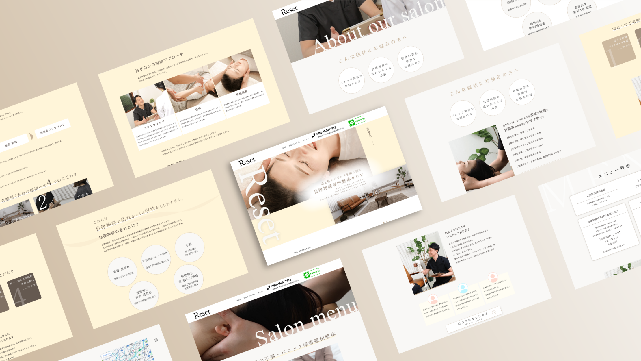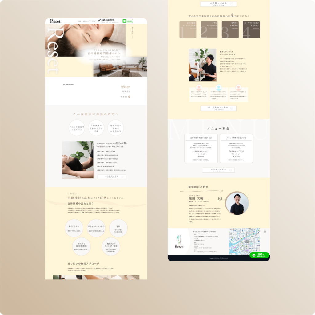 今回の制作では、心身の緊張を解きほぐす優しさと清潔感を表現するため、柔らかなベージュとホワイトを基調とした、温かみのあるナチュラルなデザインを採用しました。構成面での大きなポイントとして、まず「こんなお悩みはありませんか?」という問いかけから、それらが「自律神経の乱れ」に起因する可能性を提示し、ターゲット層の共感を促す設計としています。続くセクションでは、同店ならではの「4つのこだわり」を明確に示し、実際に寄せられた「口コミ」を併記することで、提供価値への納得感と信頼性を担保しました。また、料金メニューについても、初めての方が不安を感じないようシンプルかつ明快なレイアウトで配置し、検討から予約へとスムーズに移行できるよう配慮しています。
