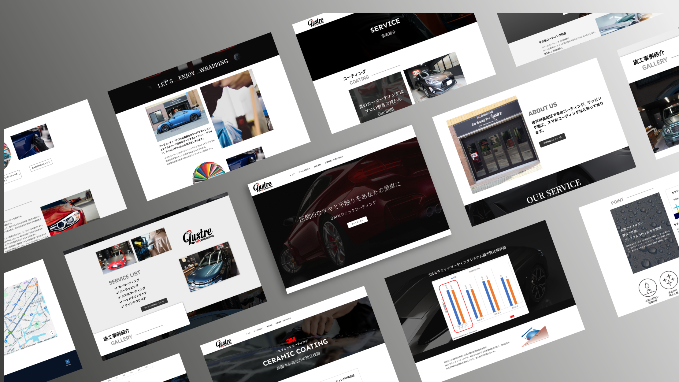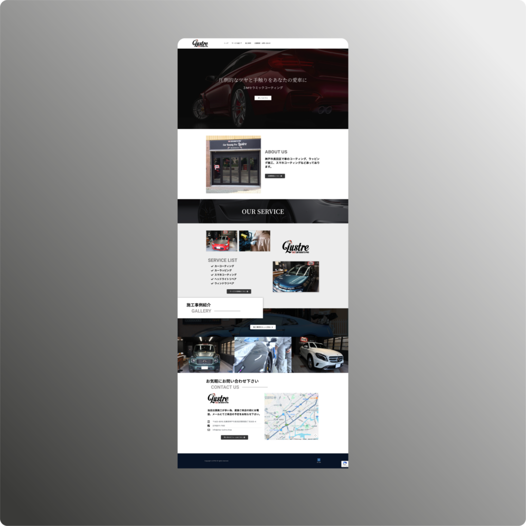 今回の制作では、車が持つ本来の造形美を際立たせるため、ダークトーンを基調とした重厚なインターフェースを採用しました。構成面では、各サービスの専門性を深く掘り下げるため、詳細ページにおいて施工ごとの「特性」や「メリット」を丁寧に解説する設計としています。カーコーティングからスマホコーティングまで、多岐にわたるメニューの技術的背景を丁寧に言語化することで、こだわりに応えるプロの選別眼を表現しました。また、サイト終盤に配置した「施工事例(GALLERY)」は、余白を活かしたギャラリー形式で展開しています。あえて文字情報を絞り、圧倒的なビジュアルクオリティを前面に押し出すことで、仕上がりへの絶対的な自信を無言で訴えかける構成に仕上げています。
