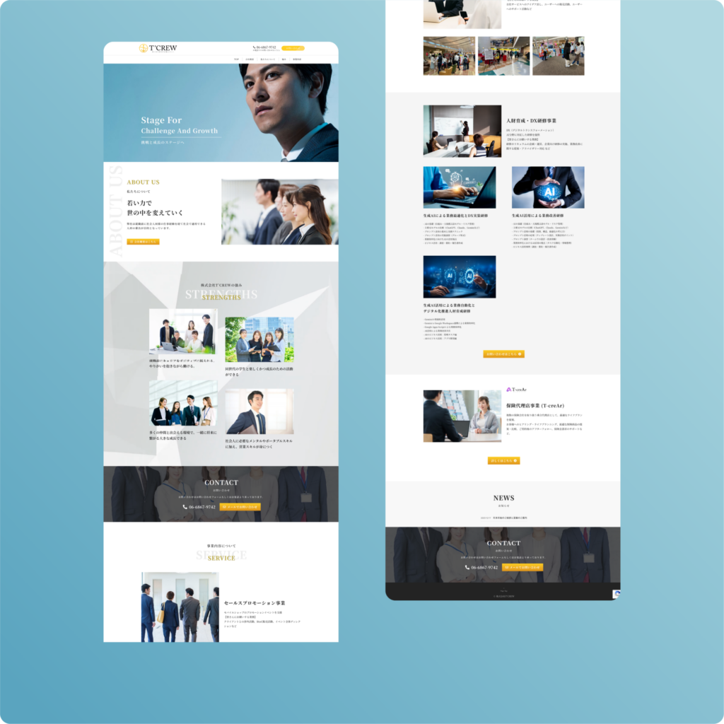 前半にSTRENGTHS、後半にSERVICEを配置し、共通の提供価値と具体的な支援内容を段階的に理解できる構成としています。これは、単なる派遣会社ではなく、課題解決を担うパートナーとして認識していただくための設計です。また、人物写真を一貫して使用することで、ITやDX支援においても人が介在する支援であることを視覚的に印象づけています。
