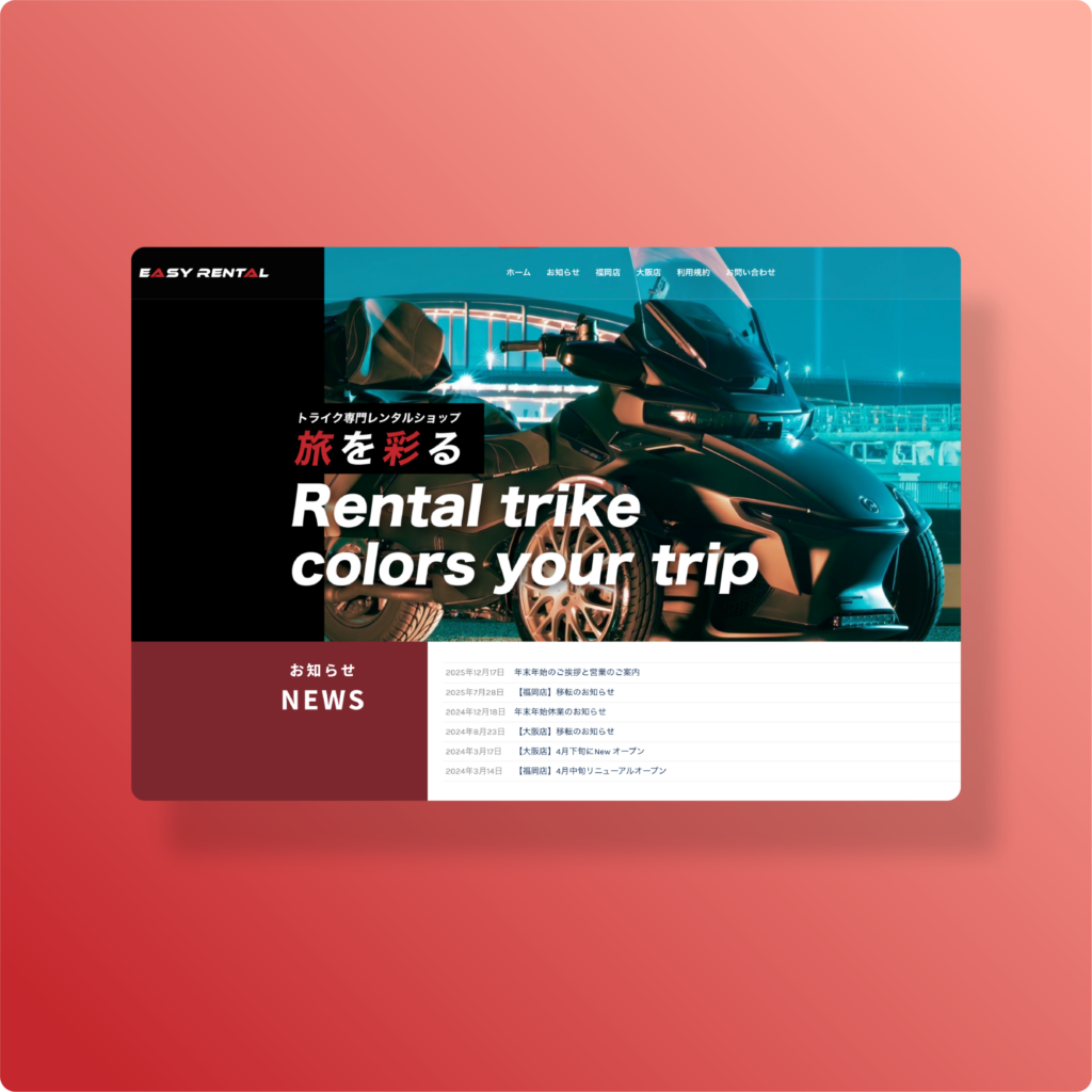 本サイトは、三輪バイク(トライク)のレンタルサービスを初めて検討される方に対し、「どんな乗り物で、どう楽しめるのか」を直感的に理解できることを目的に設計しています。トライクは認知度が高くないため、操作性や利用条件への不安を解消し、体験価値を具体的にお伝えする必要がありました。