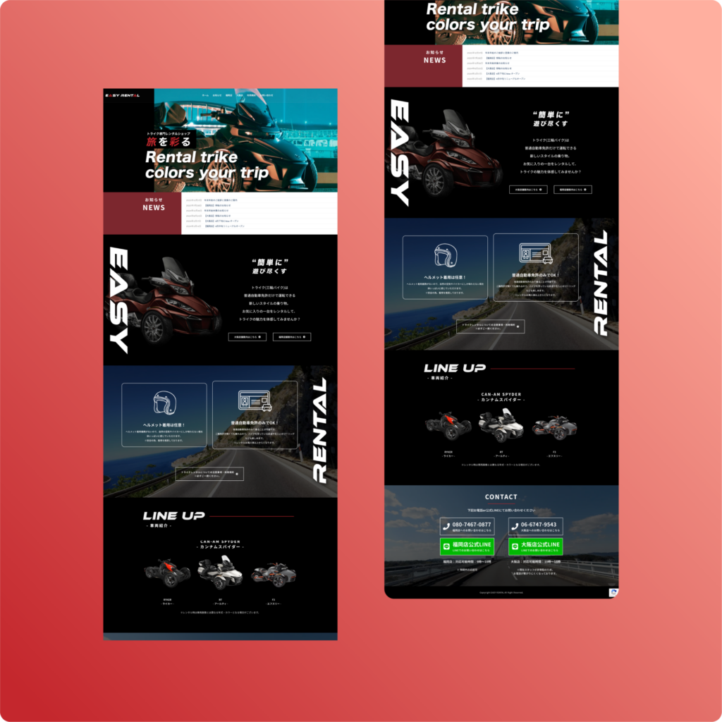 TOPページでは車両の存在感が伝わるビジュアルを大きく配置し、非日常性や高揚感を視覚的に訴求しています。あわせて、「普通自動車免許で運転可能」「ヘルメット着用任意」といった判断に直結する条件を明確に提示し、利用可否の迷いを早期に解消しています。LINE UPでは黒背景に重厚感のある車両写真を配置し、詳細なスペック説明よりも造形そのものの魅力を優先しました。また、店舗別の連絡先やLINE導線を分けて配置し、利用拠点に応じてスムーズに行動に移せる設計としています。