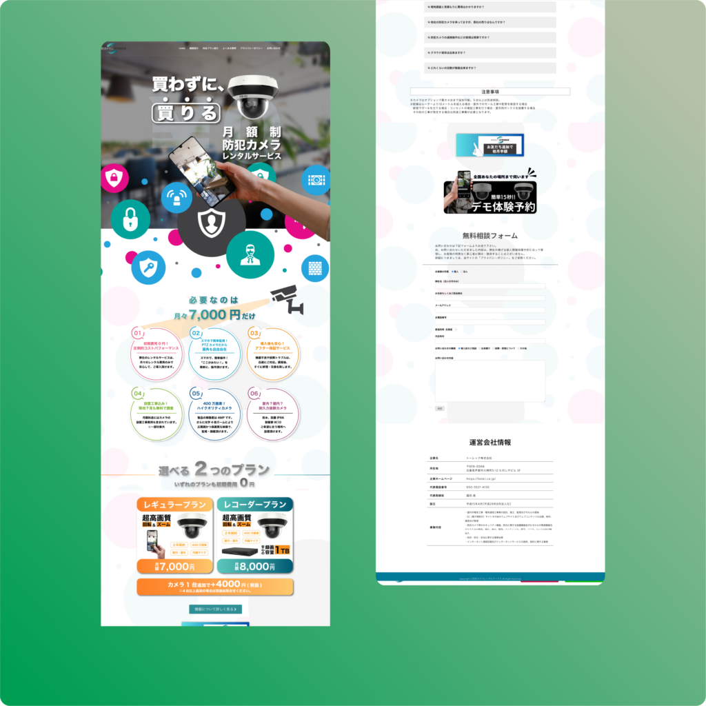 今回の制作では、安心感と親しみやすさを与えるため、明るい配色と丸みを帯びたアイコンを活用したデザインを採用しました。これは、防犯サービスが持つ堅苦しいイメージを和らげ、幅広い業種の方が相談しやすい雰囲気を作るためです。ファーストビューに「買わずに、借りる」というキャッチコピーを大きく掲げ、月額料金や選べるプランを整理して配置することで、検討される方がコストとサービス内容を瞬時に把握できる構成としました。また、購入とレンタルの比較図を設けることで、サービスの優位性を分かりやすく示しています。
