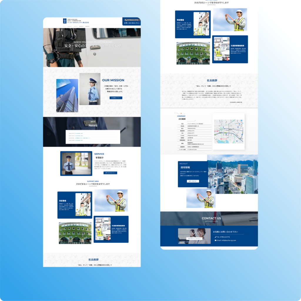 本サイトの目的は、警備サービスを求める企業や自治体に対し、同社の「誠実さ」と「確かな守りの技術」を示し、信頼に基づく新規案件の獲得や採用強化につなげることです。安全を守るプロフェッショナル集団としての姿勢を明確に打ち出し、地域社会へ安心感を届けるプラットフォームを目指しました。