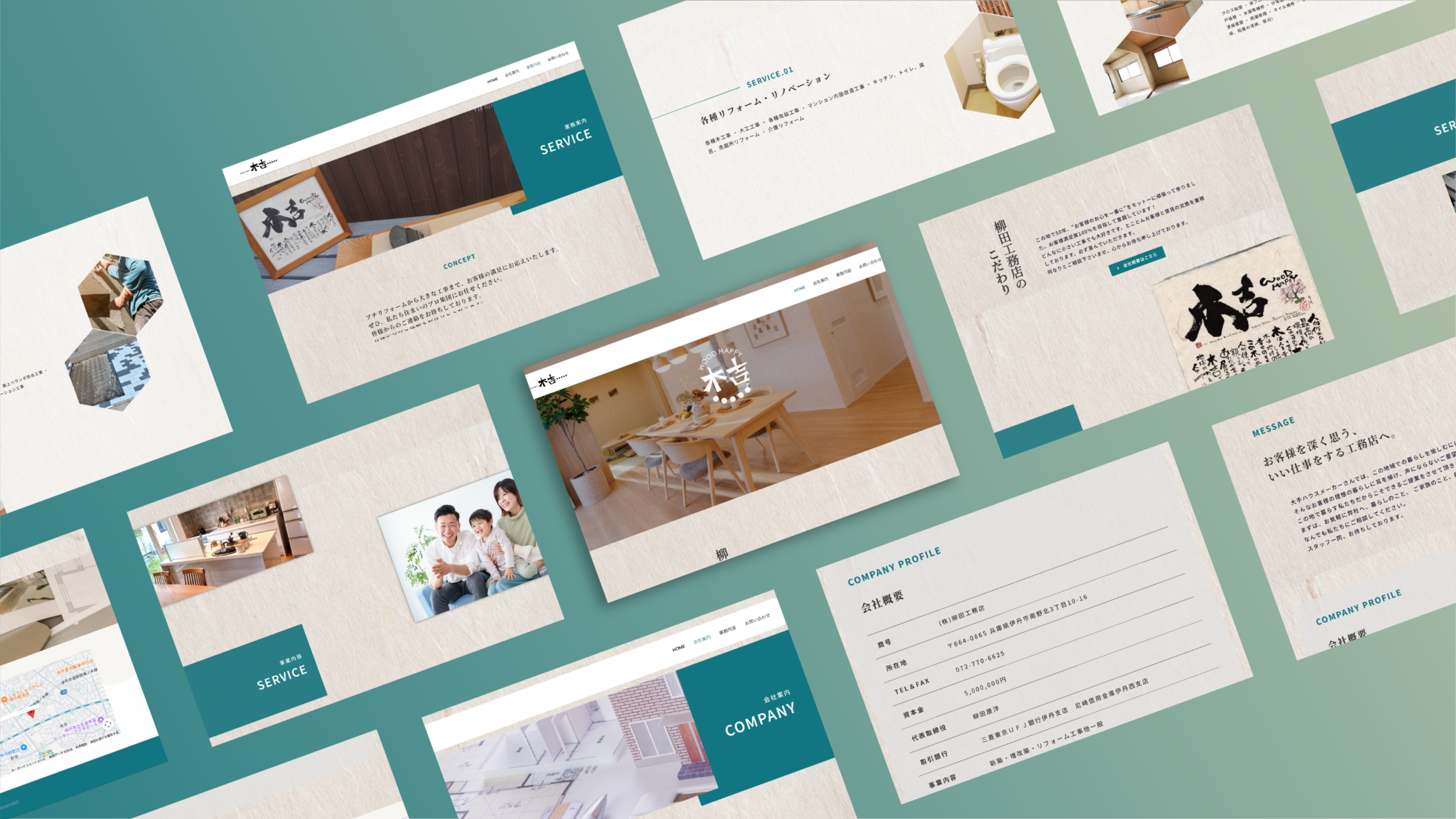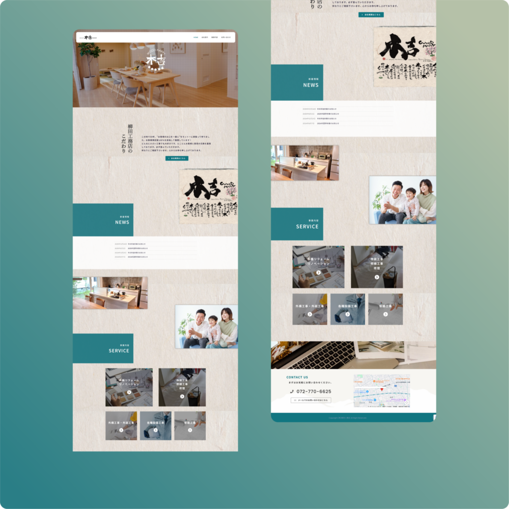 今回の制作では、冒頭に「こだわり」のセクションを配置することで、住宅の機能面だけではなく、家づくりへの想いといった情緒的な価値から共感を醸成する構成を第一に考えました。その上で、具体的な検討をサポートするため、サービス紹介(SERVICE)セクションでは各項目に写真を添え、リフォームから新築工事まで幅広い業務内容を直感的に把握できるレイアウトを採用しています。また、検討段階の不安を解消するため「施工の流れ」を分かりやすく整理して掲載しました。相談から完成までの工程を段階的に提示することで、初めて家づくりを行う方でも、全体の進め方を理解できる設計としています。