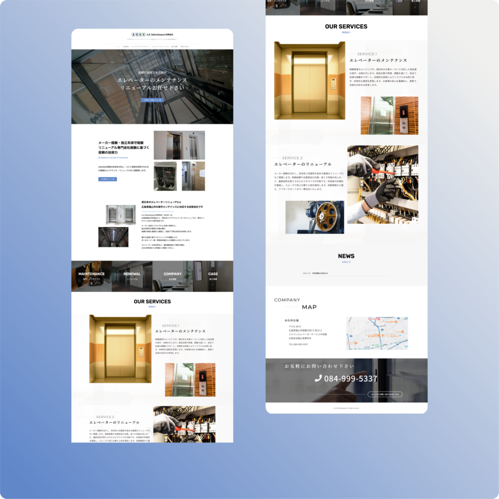 今回の制作では、情報の透明性と誠実さを伝えるため、余計な装飾を削ぎ落としたクリーンで機能的なレイアウトを採用しました。構成面での大きなポイントとして、冒頭で「メーカー系・独立系を問わない対応力」を明確なメッセージで打ち出し、どのようなエレベーターでも相談可能であるという安心感を即座に提示する設計としています。続く「OUR SERVICES」では、日々の安全を支える「メンテナンス」と、資産価値を高める「リニューアル」を二大柱として大きく配置しました。また、ページ内には写真付きの「施工実績」セクションを設け、実際の作業風景やビフォーアフターを視覚的に提示することで、技術へのこだわりと確かな仕事ぶりを直感的に理解できるよう配慮しています。