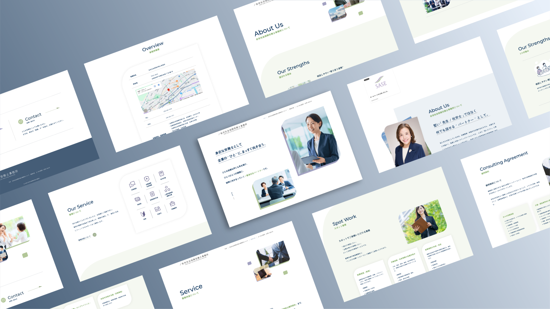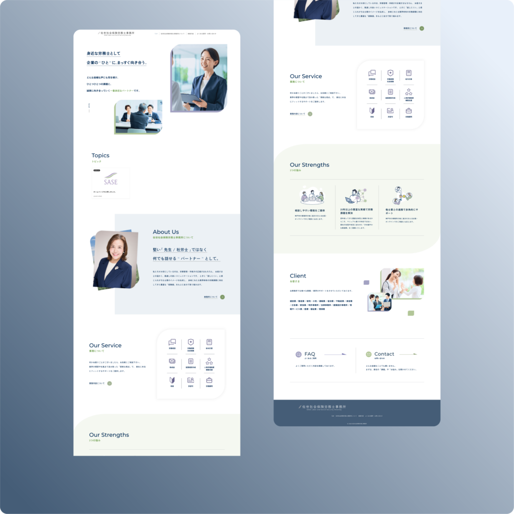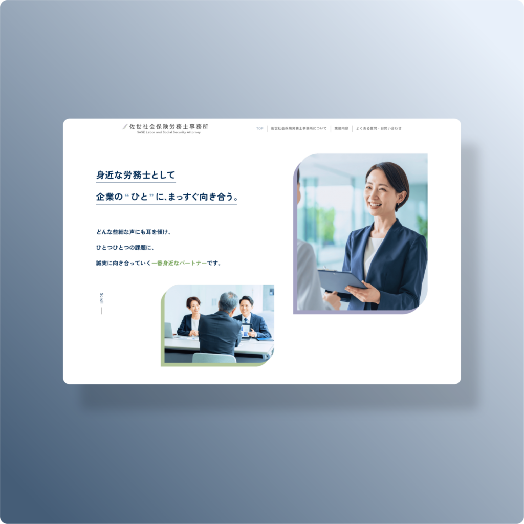 佐世社会保険労務士事務所は、神戸市を拠点に労務管理・社会保険手続きを支援する事務所です。新規開設にあわせ、相談のきっかけとなる問い合わせ導線と、事務所の人物像を伝えることを目的としてホームページを制作しました。