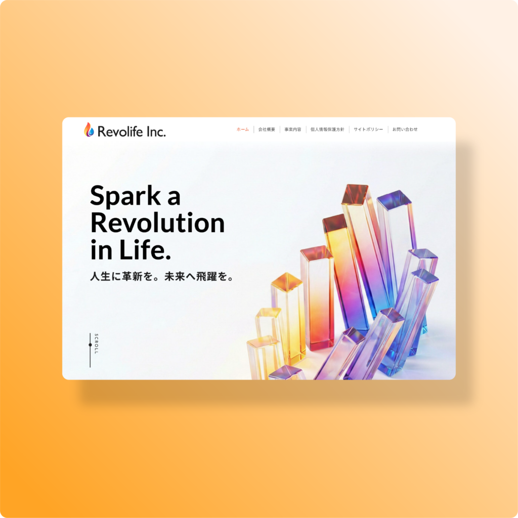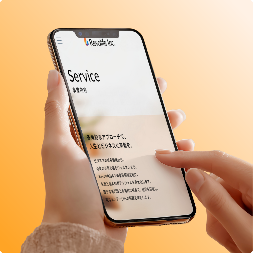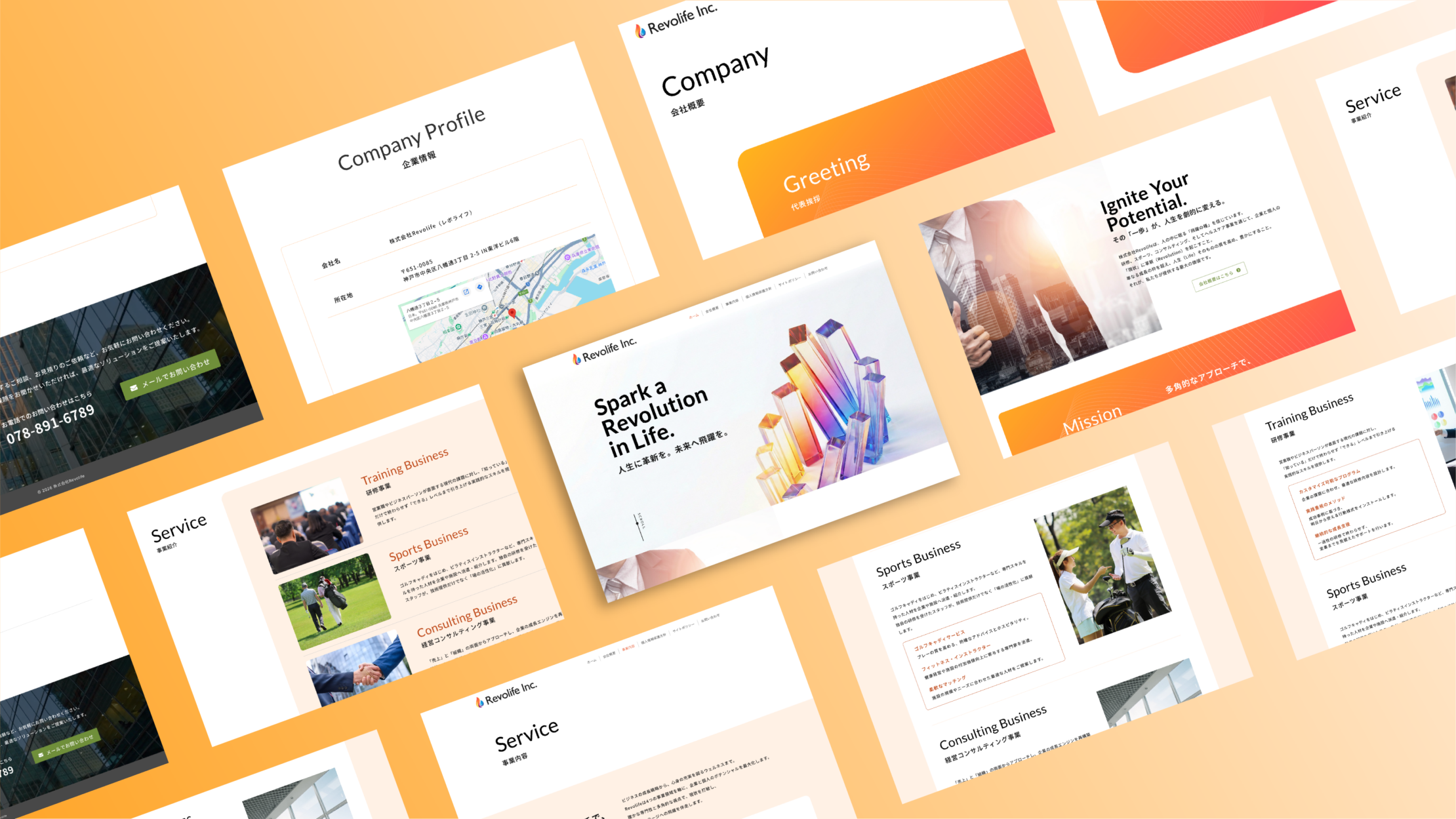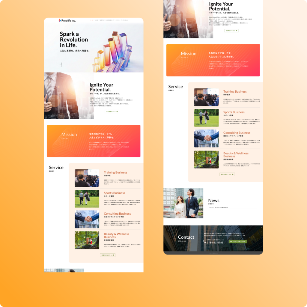株式会社Revolifeは、研修・スポーツ・経営コンサルティング・美容健康の4領域を手がける多角経営の企業です。事業範囲が広いため、初見の訪問者に会社像を正しく理解してもらうことと、領域ごとの問い合わせ窓口として機能させることを目的としています。