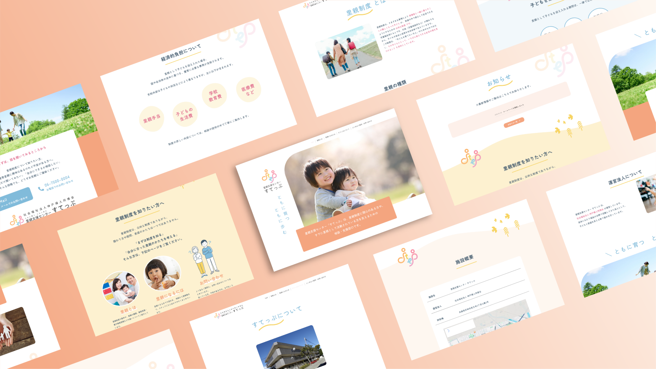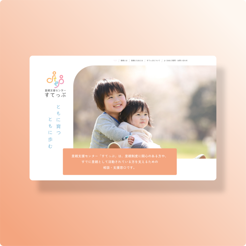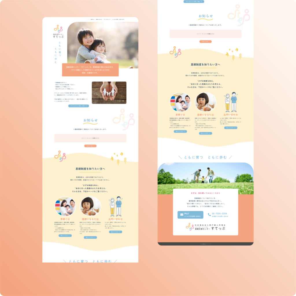 里親支援センター「すてっぷ」は、社会福祉法人神戸婦人同情会が運営する里親制度の相談・支援窓口です。里親制度に関心を持ちはじめた段階の方から、すでに活動中の里親の方までを対象に、問い合わせ前の不安を和らげ、相談の一歩を踏み出してもらうことを目的にサイトを制作しました。